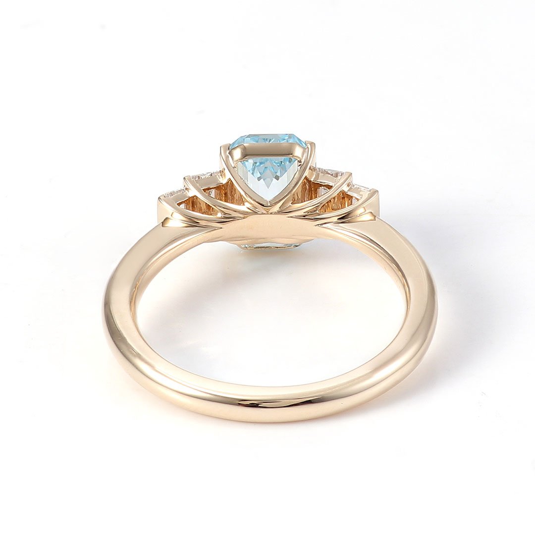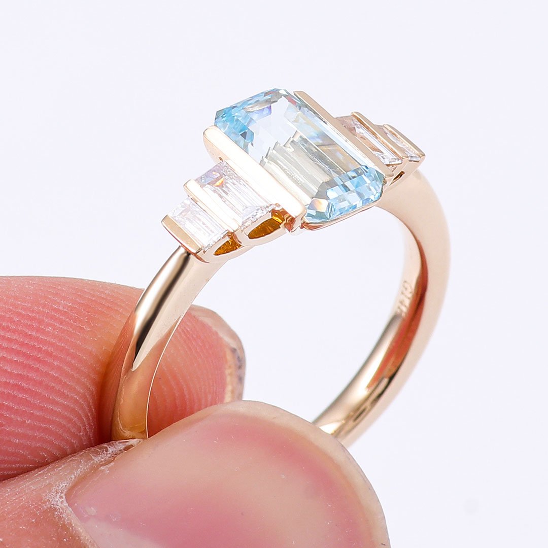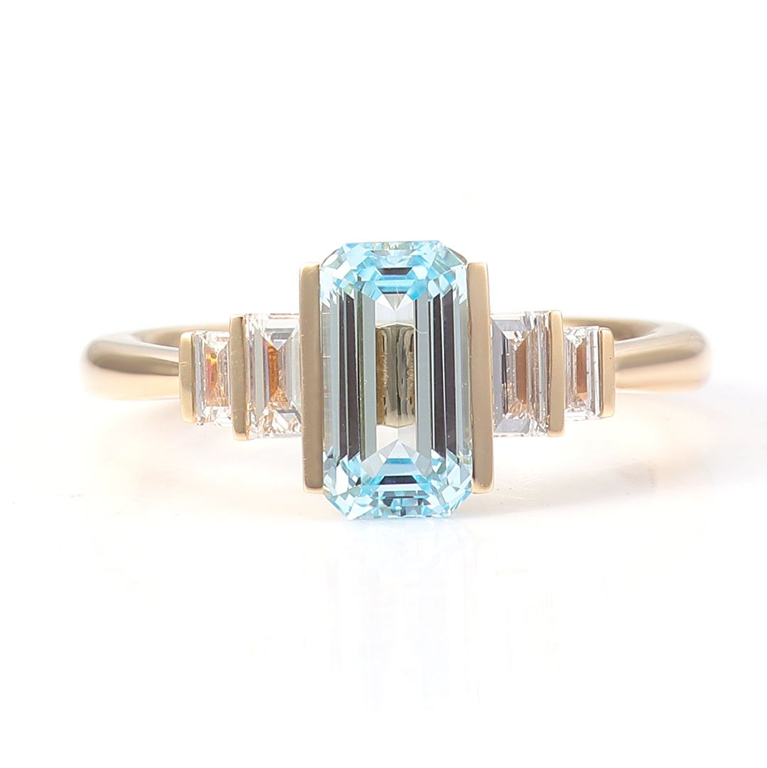 Experience the allure of our “Contemporary Emerald Cut Aquamarine and Diamond Ring.” This captivating piece features a stunning Emerald Cut Aquamarine center gemstone, flanked by four Emerald Cut Diamonds on each side, gracefully graduated in size.