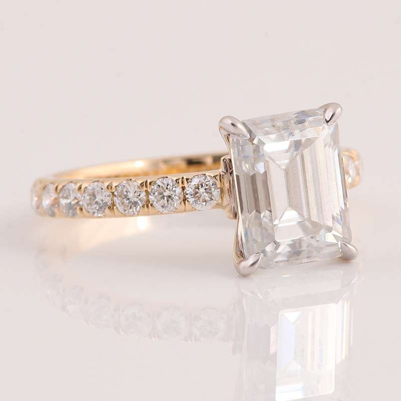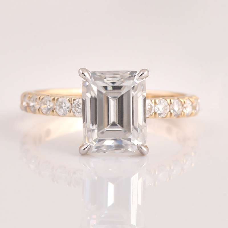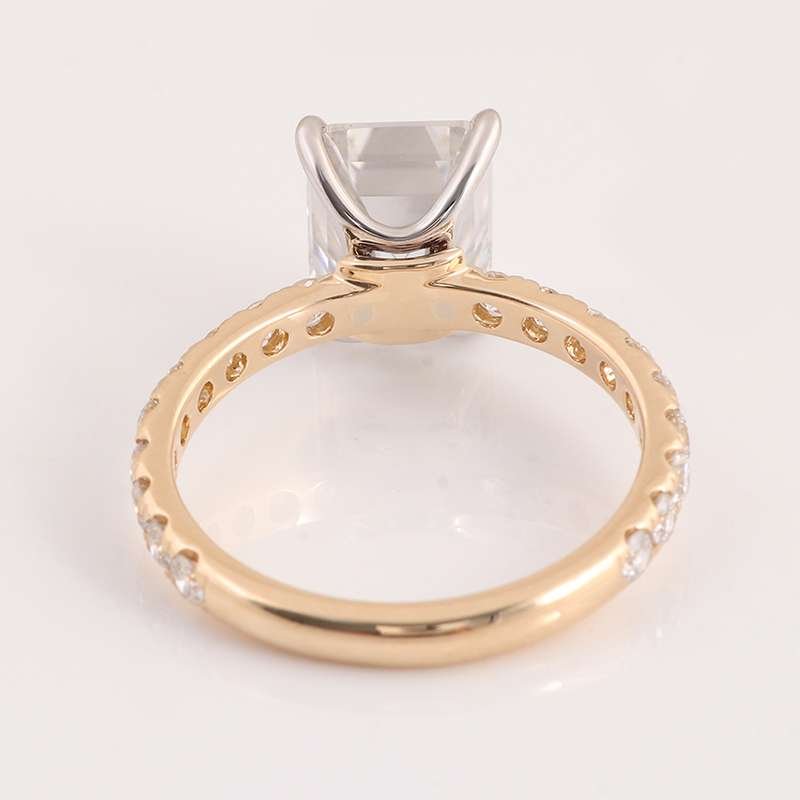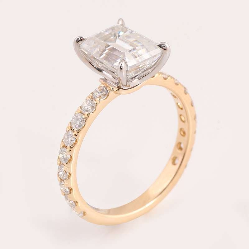 This emerald cut moissanite solitaire ring with an eternity pave band is exquisitely crafted, showcasing a timeless and elegant design that will surely captivate anyone who lays eyes on it. The centerpiece of this ring is the stunning emerald cut moissanite stone, known for its exceptional brilliance and fire. With its perfect clarity and precision cut, it radiates a mesmerizing sparkle that rivals even the most sought-after diamonds.
