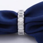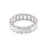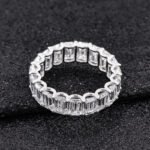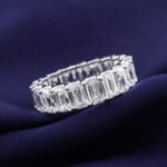 This dazzling ring features prong-set emerald cut moissanites that encircle the finger for a timeless, eye-catching look.