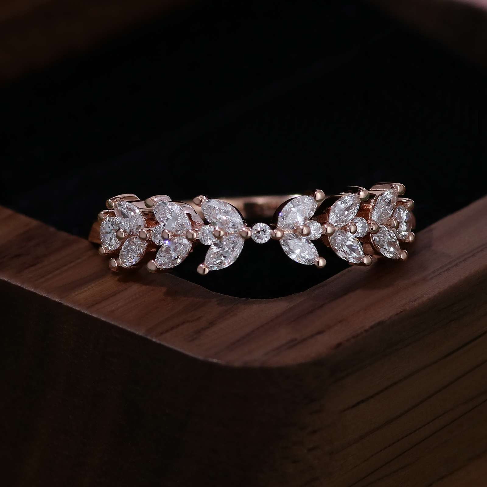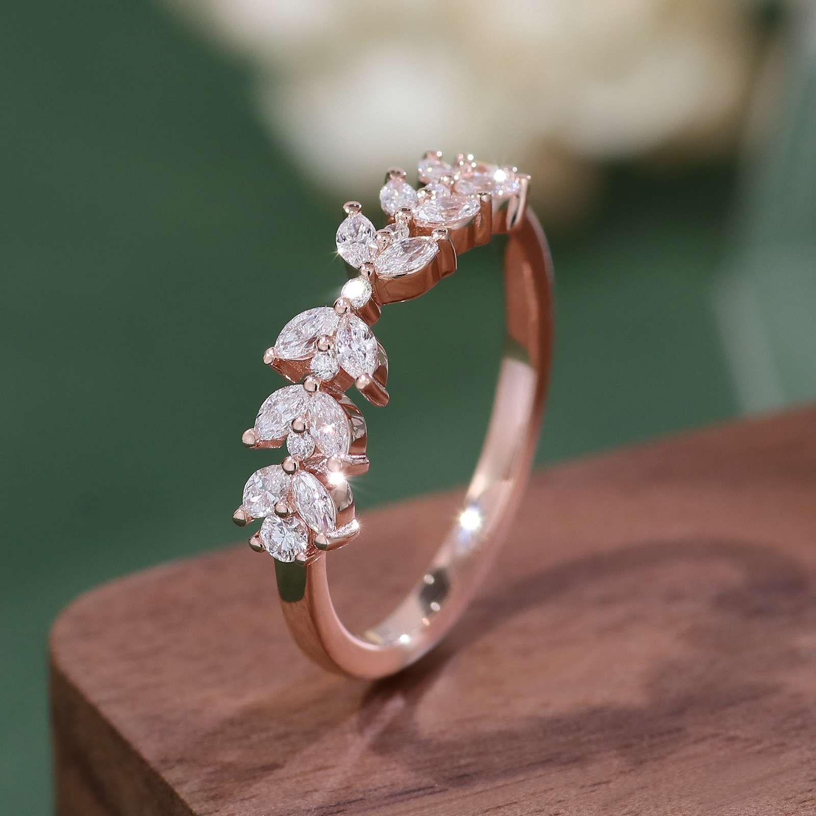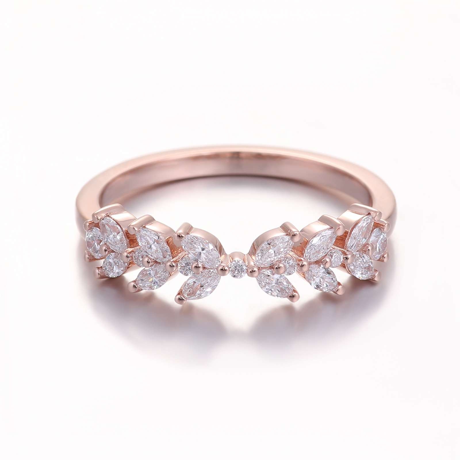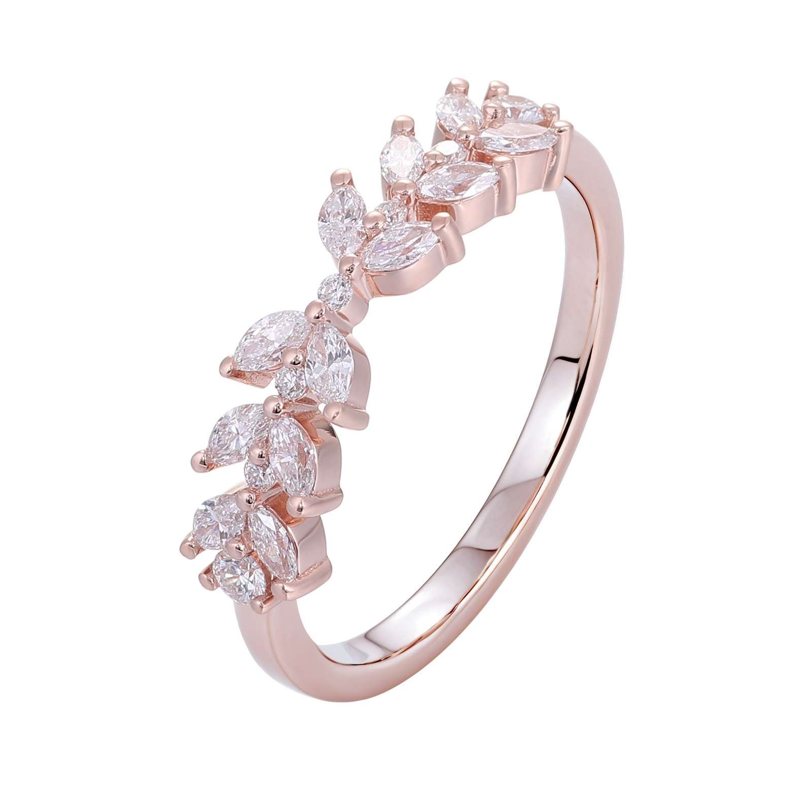 Indulge in the allure of our Enchanting Rose Gold Moissanite Ring. Crafted from luxurious rose gold, this ring is a masterpiece of elegance and charm. The VVS clarity moissanite stones, featuring a captivating combination of round and marquise cuts, are meticulously set to create a stunning display of sparkle. The intricate design exudes a romantic and feminine vibe, making it an ideal accessory for special occasions or to add a touch of glamour to your everyday look. A true statement piece that combines exquisite craftsmanship and the timeless beauty of moissanite.