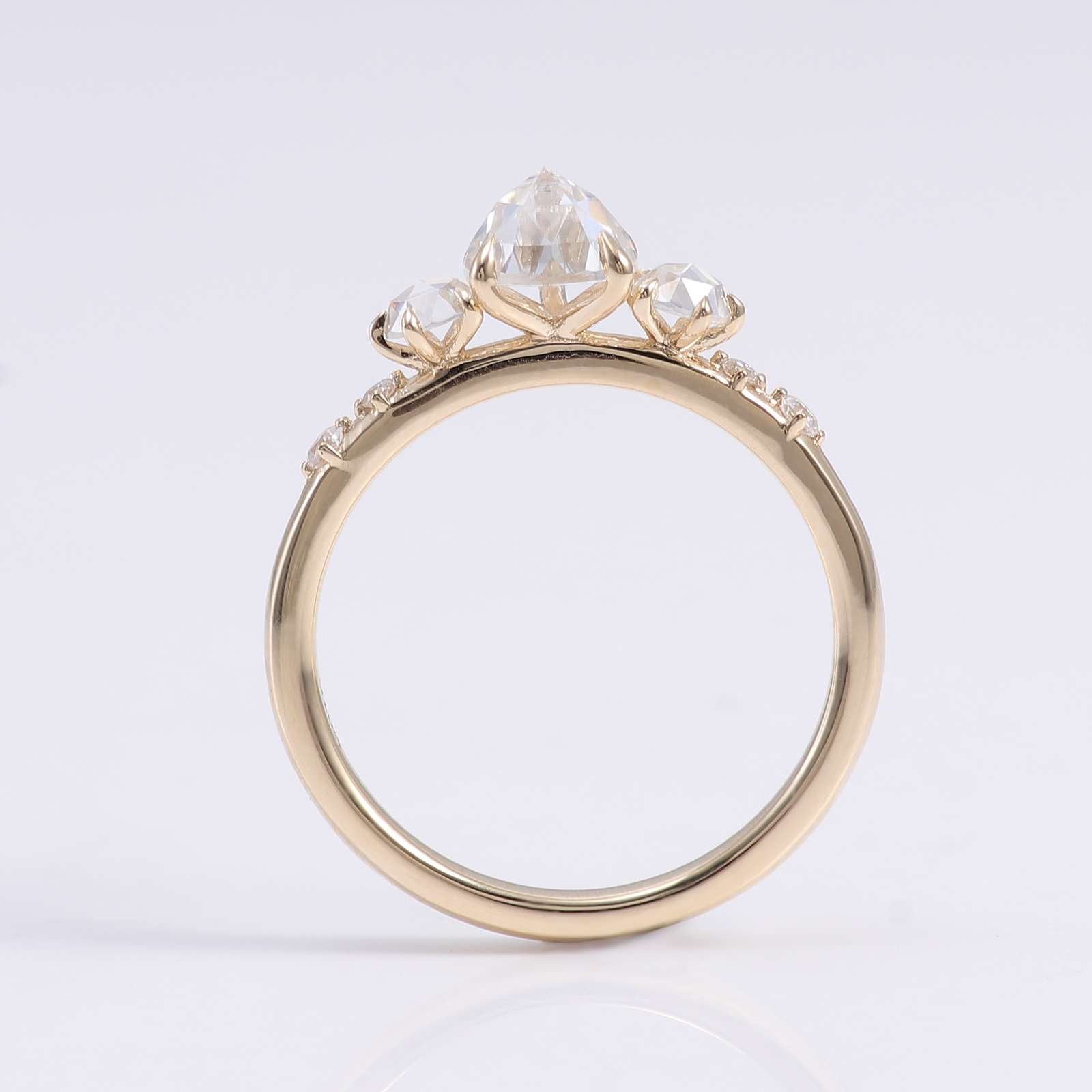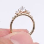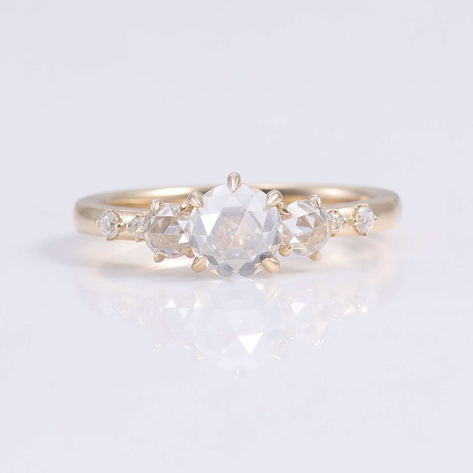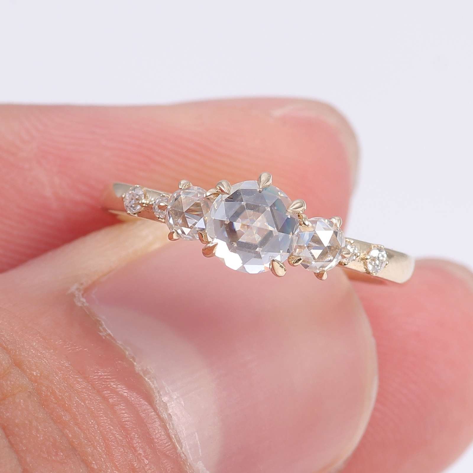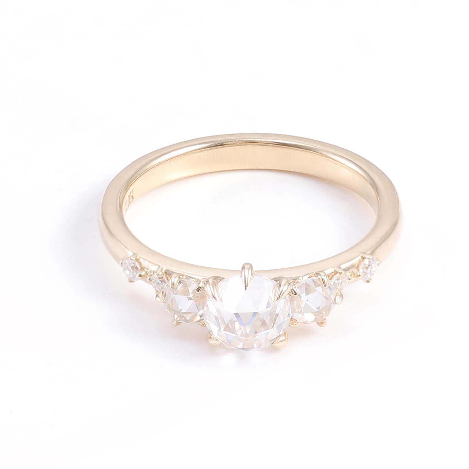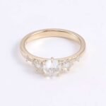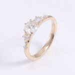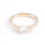 Unveil the allure of our Enchanting Yellow Gold Round Cut Moissanite Engagement Ring. At its heart lies a resplendent round cut moissanite of VVS clarity, exuding unparalleled brilliance and fire. The classic round cut, with its perfectly symmetrical facets, captures and reflects light in a dazzling display. Flanked by smaller moissanite stones on either side, the center stone is further enhanced, creating a harmonious and eye catching arrangement. The warm, lustrous yellow – gold band not only provides a luxurious setting but also complements the cool sparkle of the moissanite. This ring is a timeless symbol of love and commitment, ideal for that special proposal or as a cherished addition to your jewelry collection.