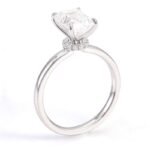 This is a Emerald Cut White Gold Ring. It features a VVS clarity moissanite stone with an emerald cut, elegantly set in white gold. The moissanite, with its high clarity, sparkles brilliantly. The base of the main stone is adorned with smaller moissanite stones, adding extra glamour. The sleek white gold band complements the stones perfectly, creating a harmonious and luxurious piece of jewelry. Ideal for those who appreciate fine and sophisticated accessories.