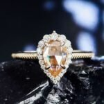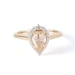 Adorn yourself with this stunning yellow gold ring! It features a pear cut moissanite as the centerpiece, surrounded by a delicate halo of moissanite accents. The warm yellow gold band complements the gem’s brilliance, creating a timeless and elegant look. Perfect for engagements, anniversaries, or adding a touch of luxury to any outfit. A must have for moissanite lovers seeking sophistication.