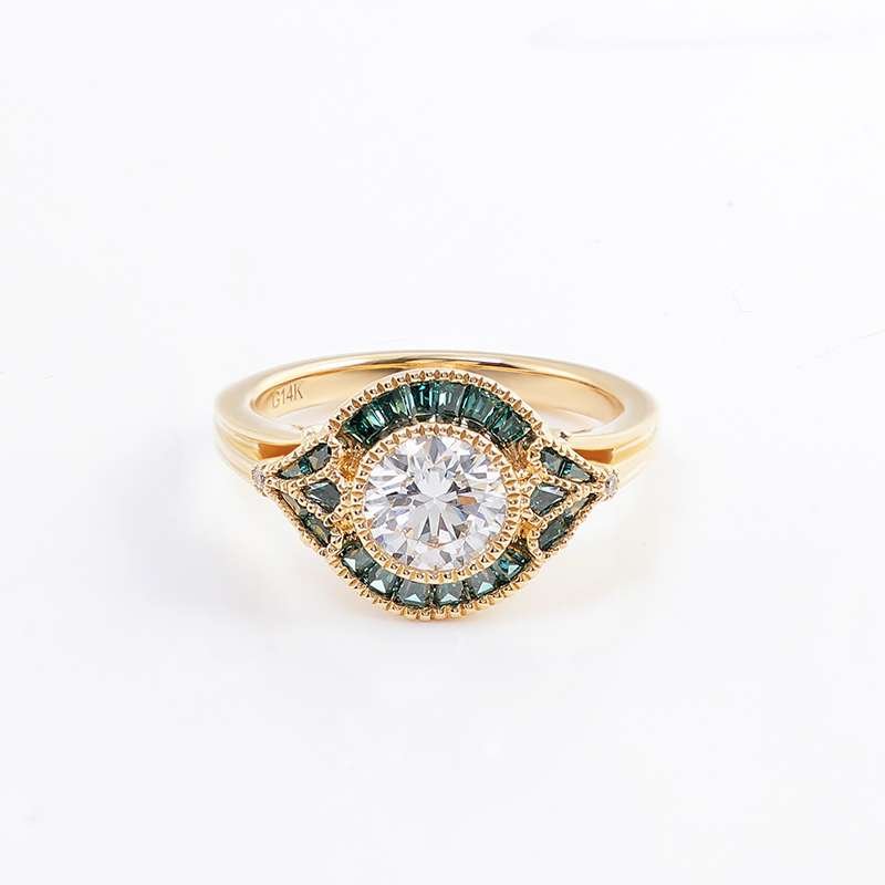 Exquisite Round Diamond Ring with Green Accents and Filigree Design