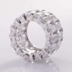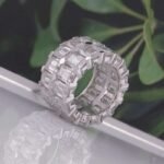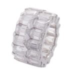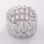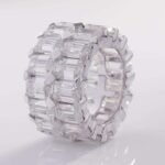 This White Gold Emerald cut Moissanite ring is crafted from white gold, featuring a collection of moissanite stones. The moissanites have a remarkable VVS clarity, ensuring a high quality sparkle. The stones are cut in the elegant Emerald style, giving the ring a sophisticated and luxurious appearance