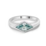 This Blue Green Moissanite Ring showcases a VVS clarity moissanite stone set in premium white gold. The combination of the elegant moissanite and the smooth white gold band results in a modern and sophisticated piece. Ideal for those seeking a luxurious and eye catching accessory.