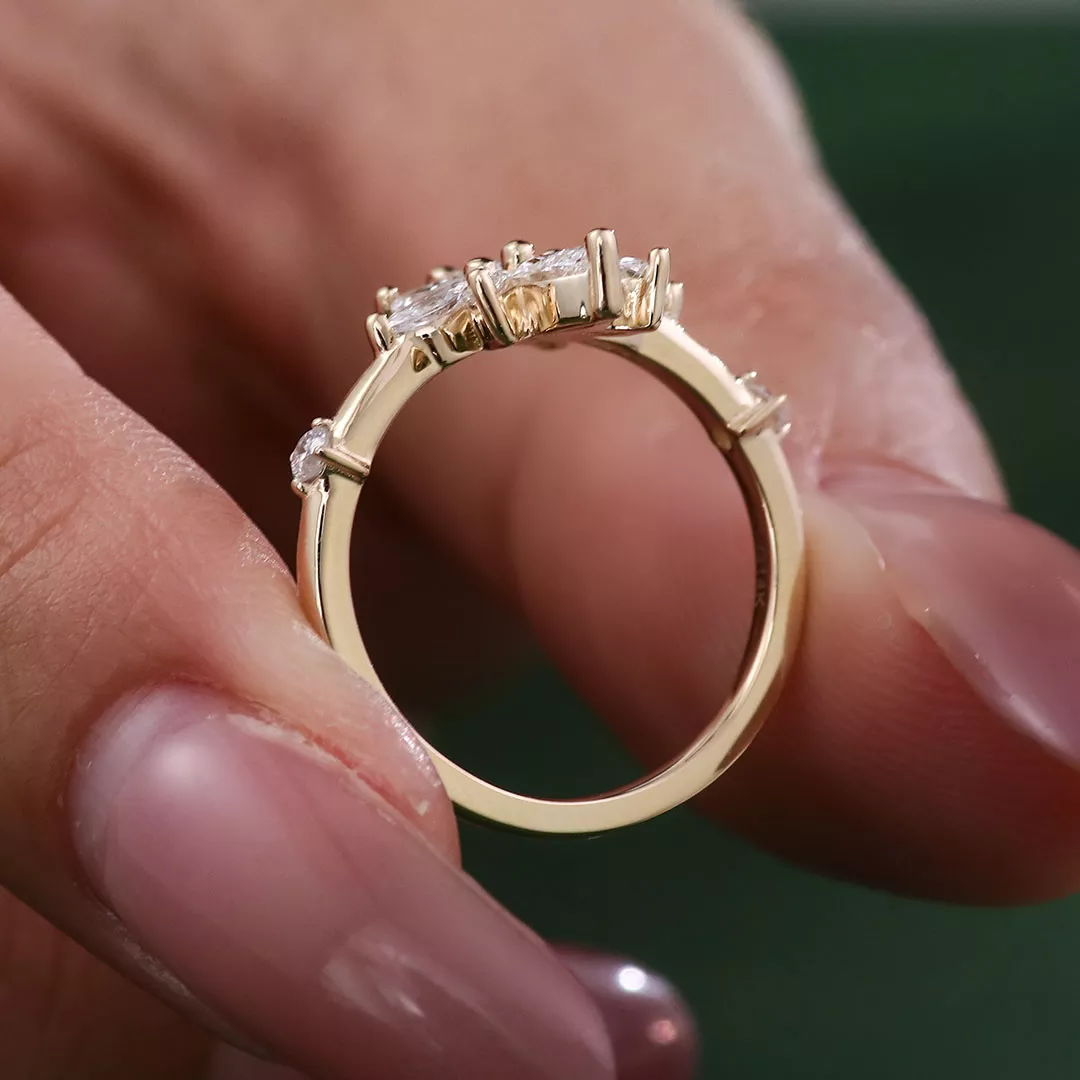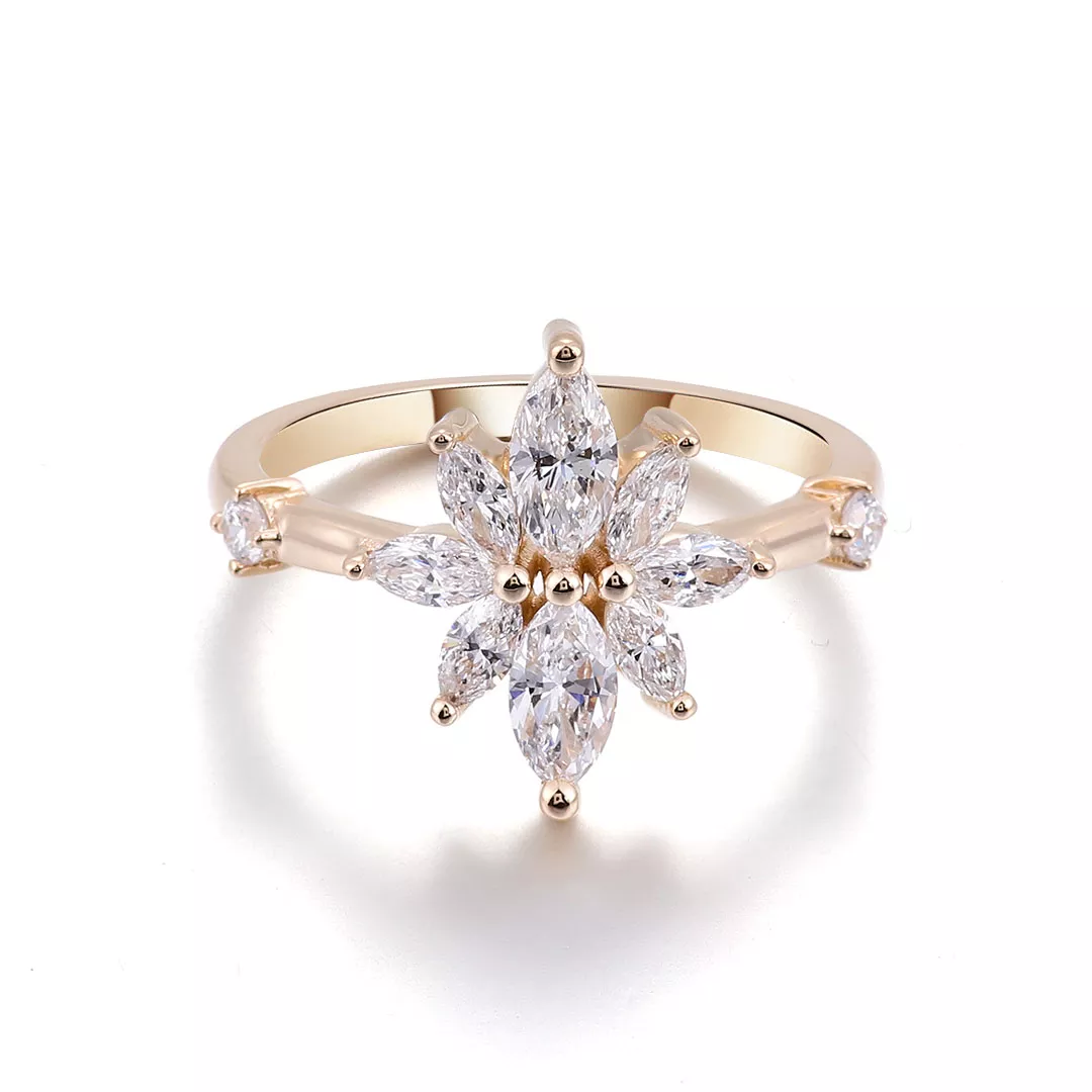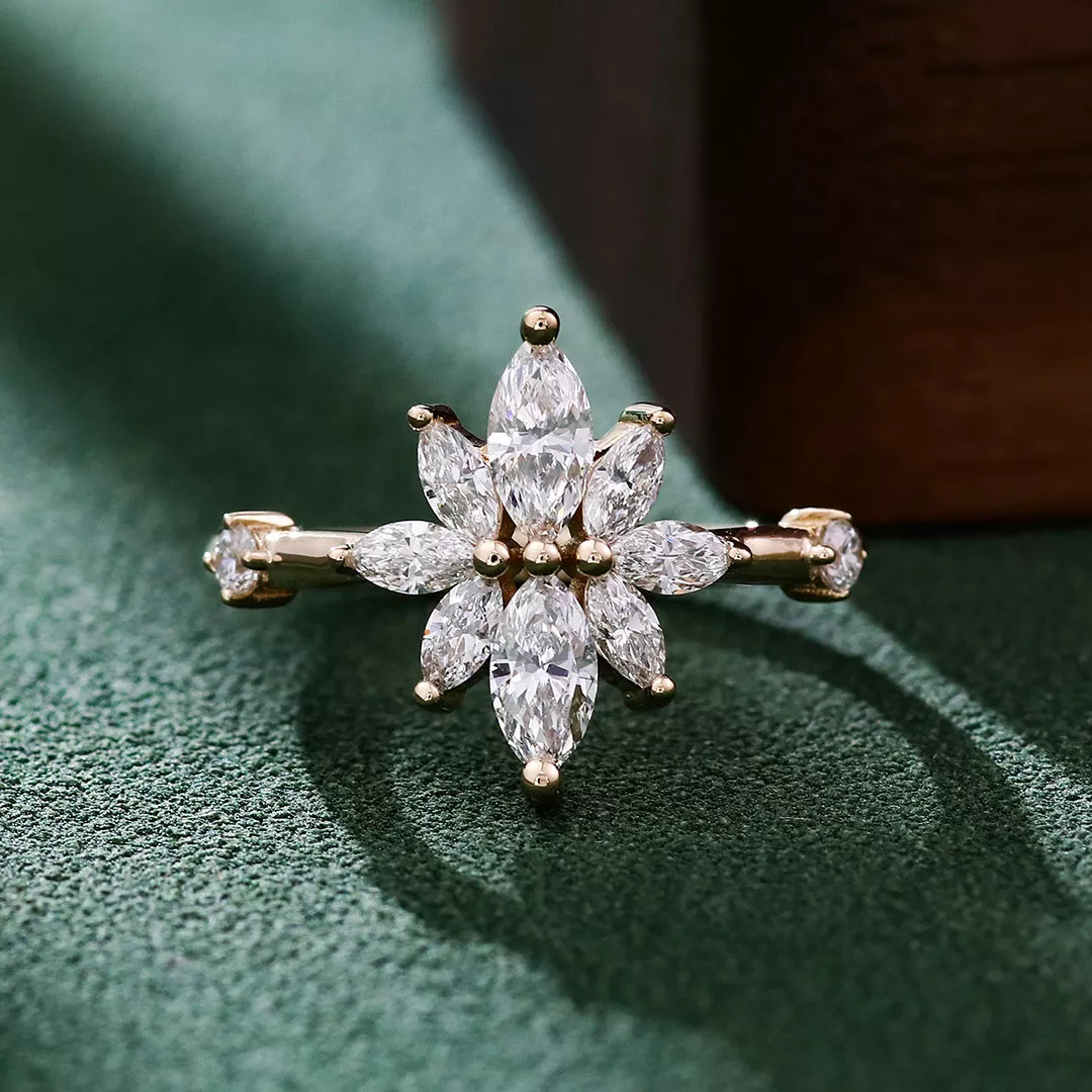 Floral Symmetry Moissanite Ring blossoms with a central marquise-cut moissanite flanked by radiating tiers of round and marquise moissanites, collectively weighing 1.2 carats total. This engineered bloom features precisely tapered stones forming petal gradation—from marquise extensions to micro-round centers. Set within a warm metallic framework, the stones’ ice-fire scintillation contrasts with golden undertones.White voids amplify dimensional depth, proving floral elegance can emerge from precise gem choreography.