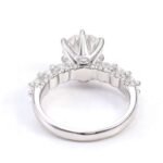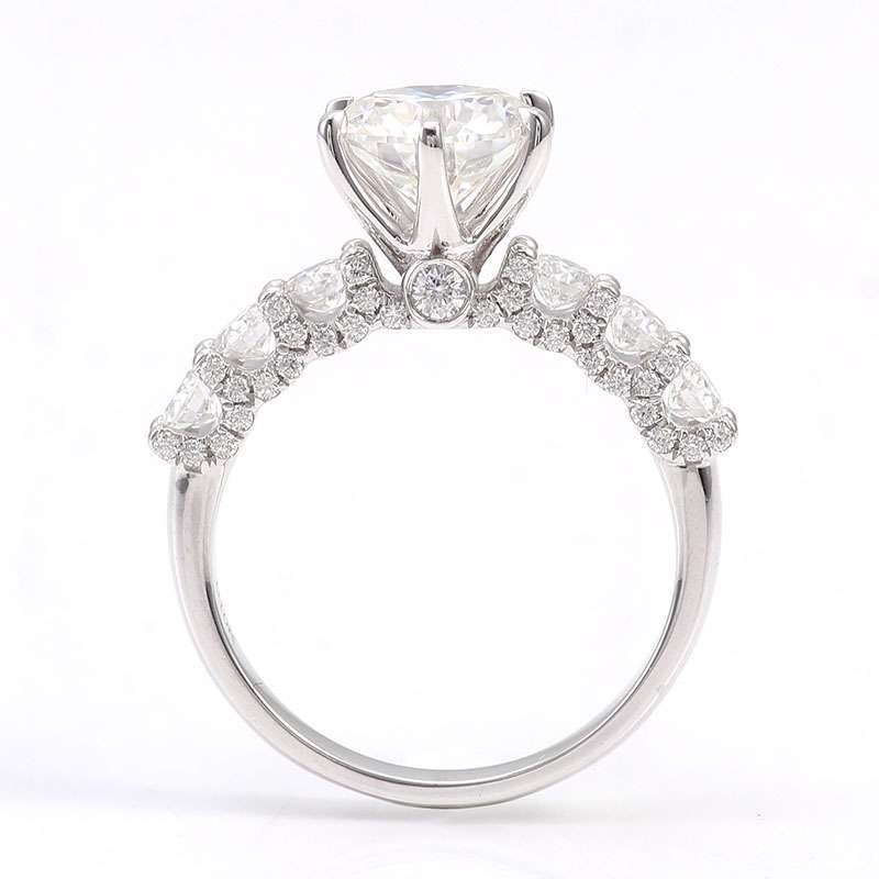 This Round Cut Moissanite Ring features a stunning round cut moissanite with a VVS clarity, set in white gold. The main stone is complemented by an array of smaller moissanite stones along the band, enhancing its sparkle and elegance. The round cut moissanite at the center is the highlight, radiating a luxurious charm.