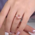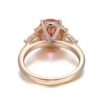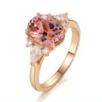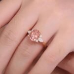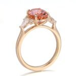 This captivating Morganite Ring is made of 18K rose gold, presenting a modern and stylish look. The prominent 8x10mm oval Morganite, weighing 3CT, takes the center stage with its gentle and alluring color. Complemented by the DEF color pear-shaped Moissanite (3x5mm) and four DEF color round Moissanite stones, it creates a powerful and dazzling effect. The combination of these precious stones and the 18K rose gold setting makes this ring a statement piece that can effortlessly enhance any outfit. Ideal for those who seek a touch of luxury and a modern aesthetic in their jewelry collection.