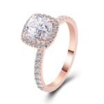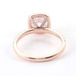 Fall in love with this stunning engagement ring! It features a VVS clarity cushion cut moissanite as the centerpiece, surrounded by a halo of smaller moissanite stones and more moissanite stones lined along the rose gold band. The warm toned rose gold enhances the brilliance of the moissanite, creating a harmonious and elegant look. A perfect choice for a memorable proposal.