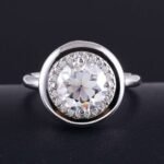 This exquisite white gold moissanite halo ring is a masterpiece of jewelry craftsmanship. At its heart lies a VVS clarity moissanite, expertly cut into a classic round shape that maximizes its sparkle and fire. Surrounding the central stone is a halo of smaller moissanite stones, meticulously set to enhance the overall brilliance and create a captivating effect. The smooth, polished white gold band complements the stones beautifully, adding to the ring’s luxurious appeal. Whether for a special occasion or as a statement piece in your collection, this ring exudes elegance and charm, making it a truly timeless treasure.