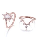 This Art Deco Ring is a stunning embodiment, expertly crafted from rose gold. At its core is a pear cut lab gemstone in a captivating cornflower blue color. Surrounding it are meticulously arranged moissanite stones, forming geometric patterns that are characteristic of Art Deco design. The symmetrical layout and the play of light on the stones create a mesmerizing display of elegance and sophistication. It’s a perfect choice for those who desire a piece of jewelry that marries vintage charm with modern luxury.