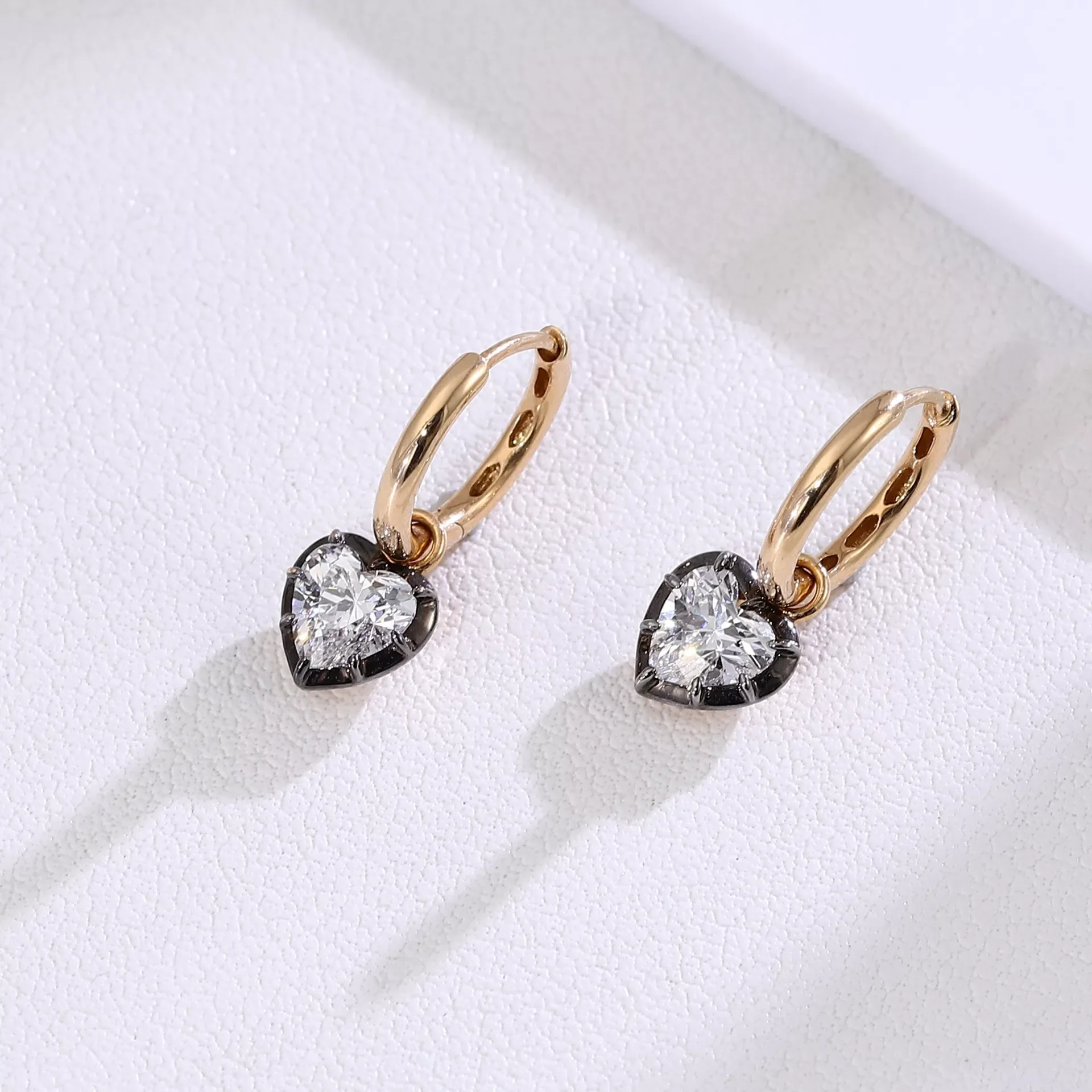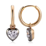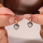 These elegant 18K yellow gold stud Lab Diamond Earrings feature a flawless heart-cut lab diamond suspended from a minimalist gold circle, secured by striking black prongs that create dramatic visual contrast. The polished gold circle frames the diamond’s graceful silhouette, while the geometric tension-setting enhances its sparkle. Designed for timeless versatility, the earrings combine romantic symbolism with modern precision, making them ideal for both daily wear and special occasions.