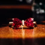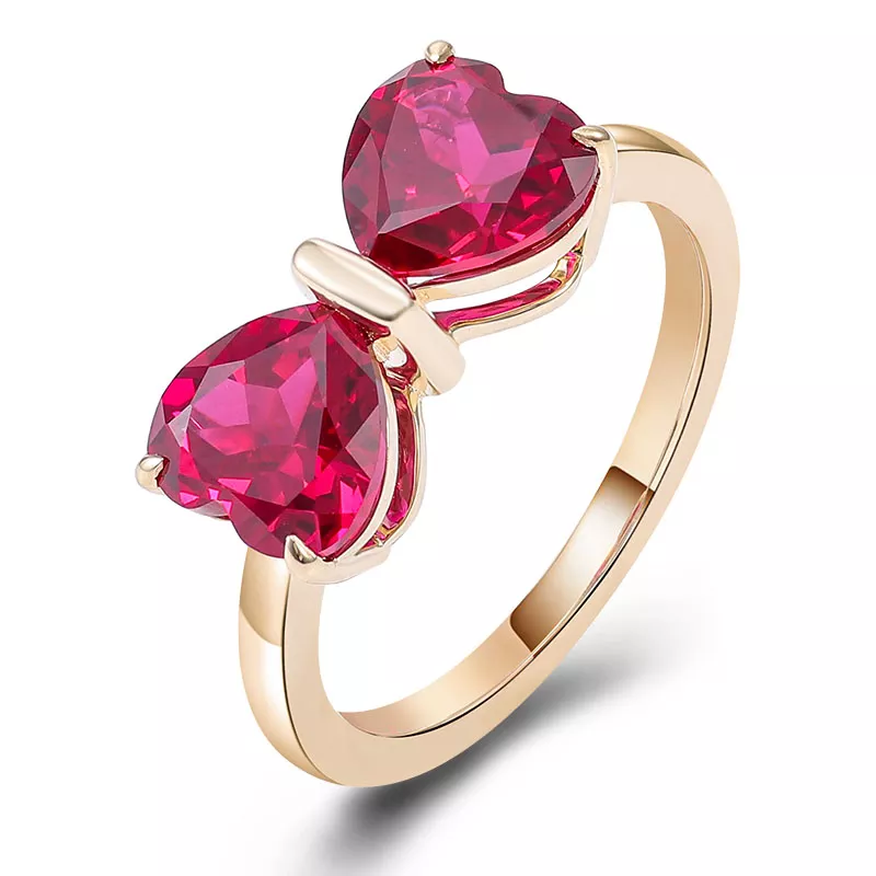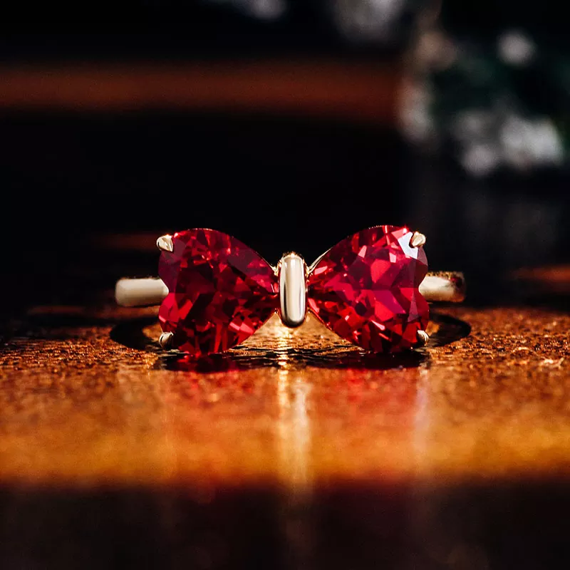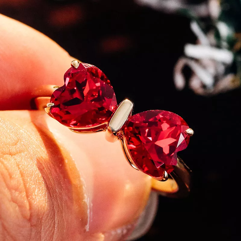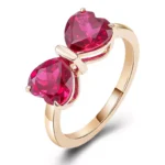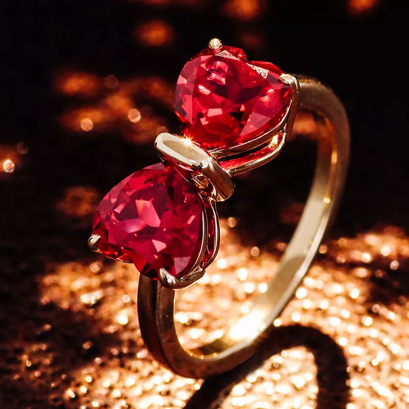 Jedi Red Heart Ring captures eternal affection through interlocked crimson hearts suspended in a yellow gold embrace. The larger heart cradles the smaller in a butterfly-wing arc, their facets igniting firelight within deep ruby cores. Brushed metal textures cradle each gem like molten lace — a whispered promise of devotion made tangible for moments that demand soul-deep romance.