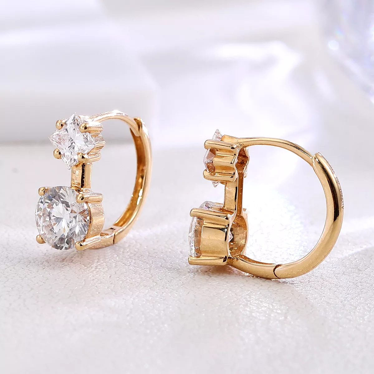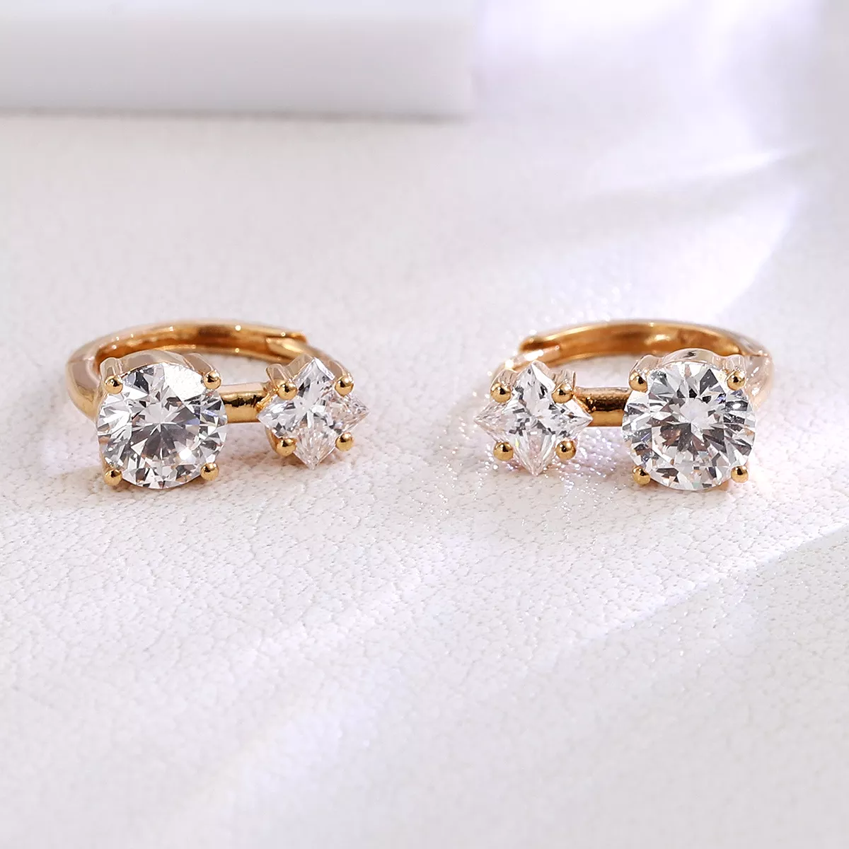 Lab Diamond Hoops Ring feature a seamless 18K yellow gold continuous hoop design, with each earring elegantly set with two lab-grown diamonds—one stunning princess-cut and the other a classic round brilliant. The round-cut lab diamond maximizes light return, while the princess cut enhances refraction for layered brilliance. The minimalist hoop structure makes it a versatile everyday accessory, yet the contrasting dual-cut design instantly elevates evening gowns for formal occasions.