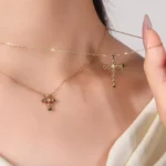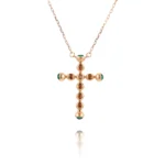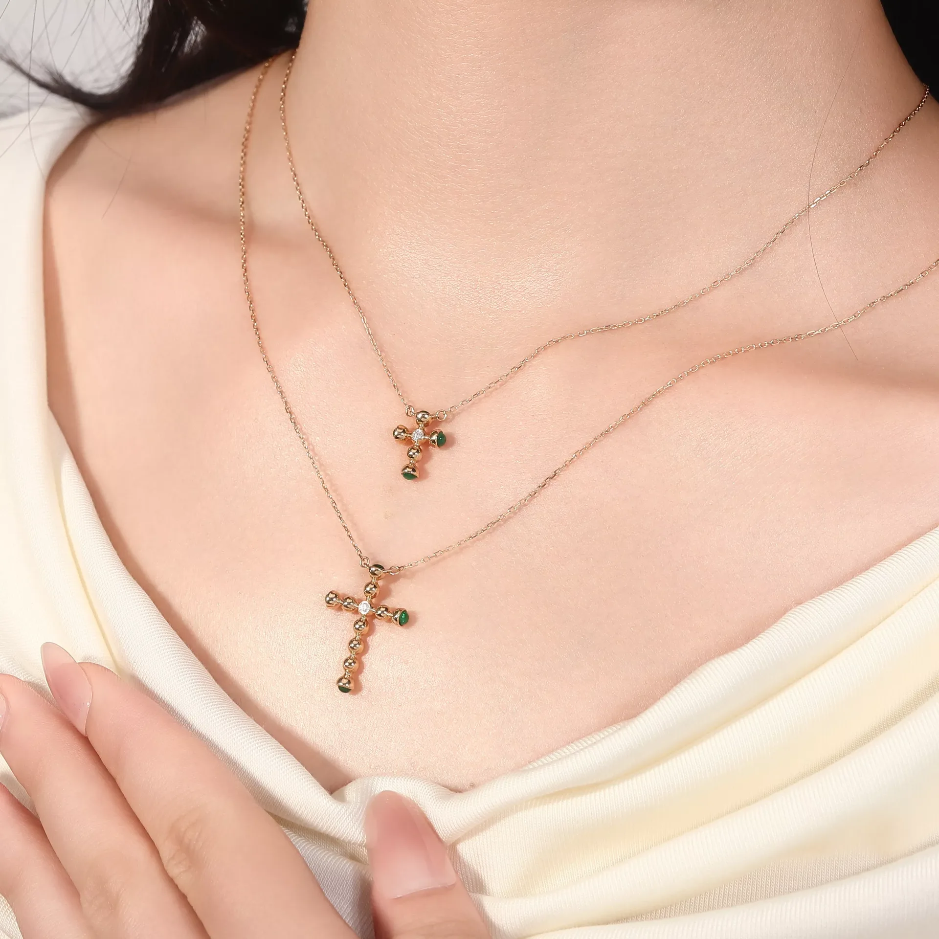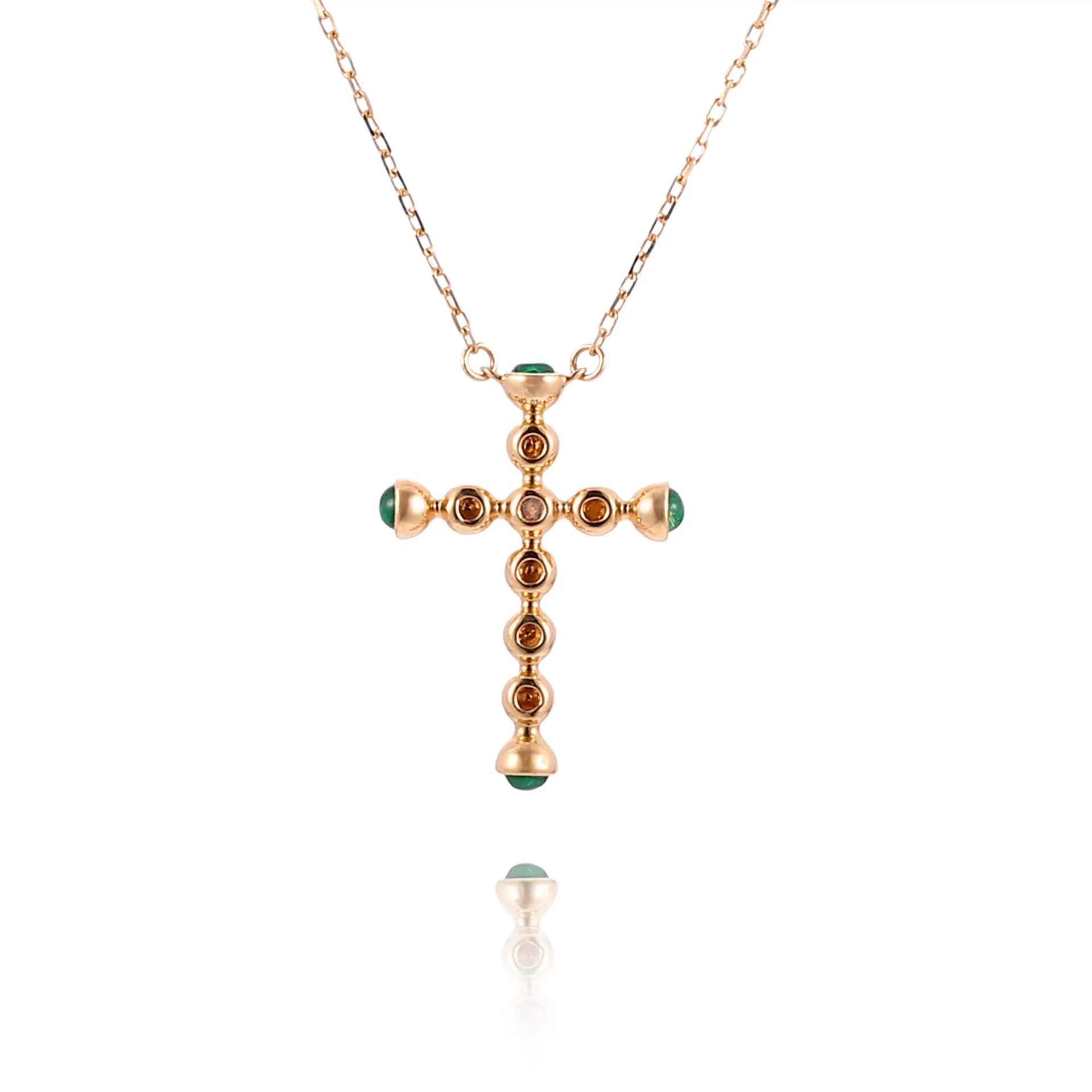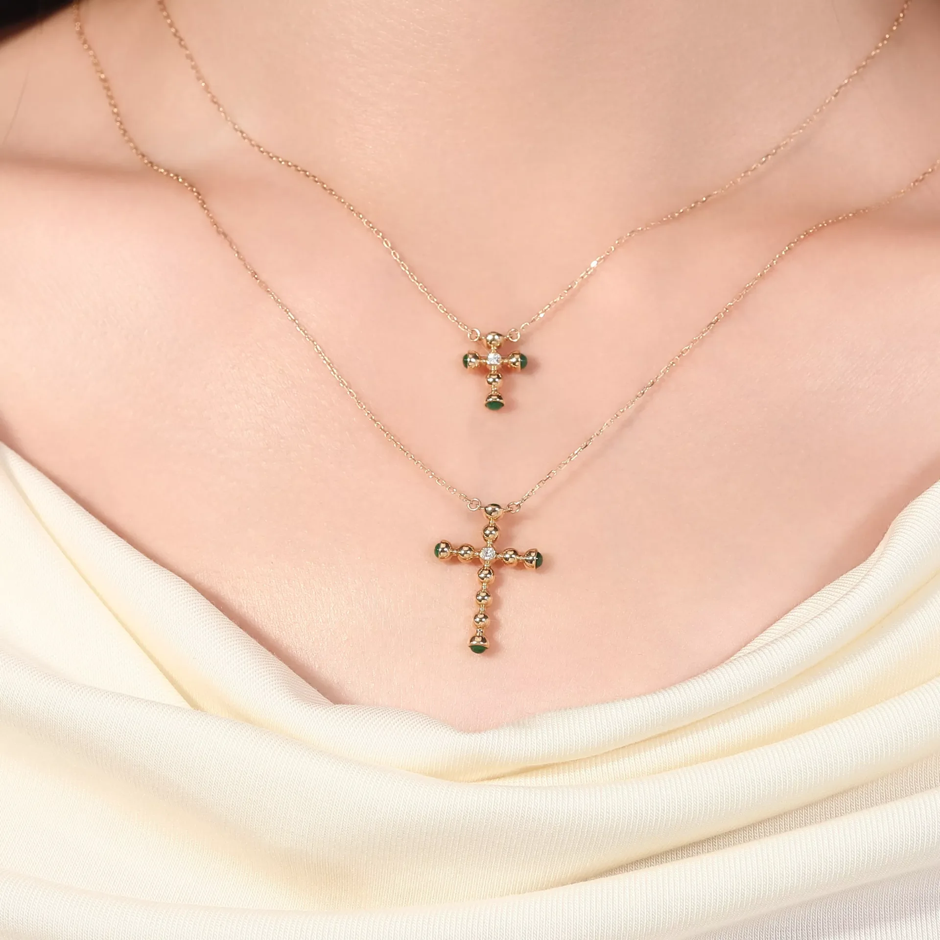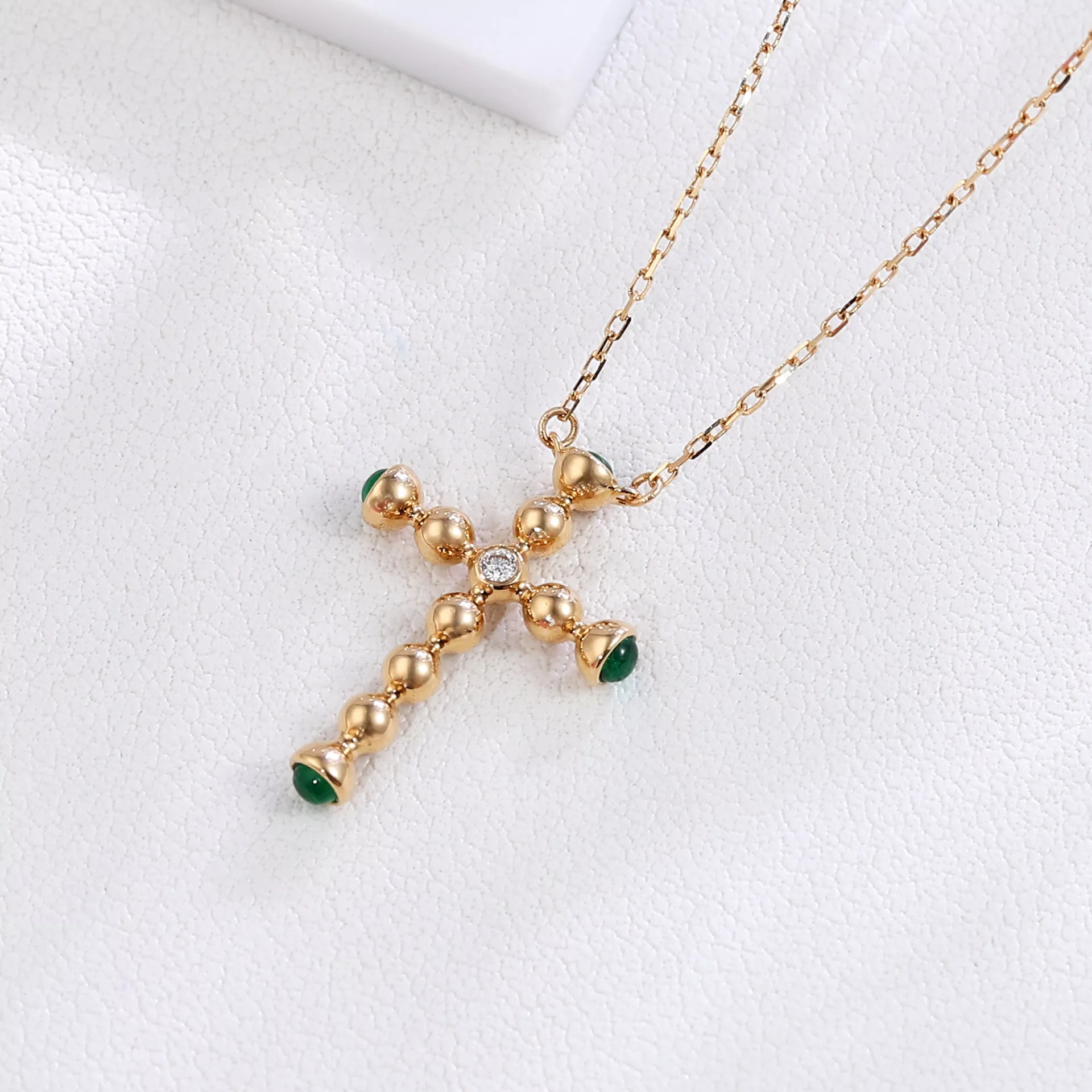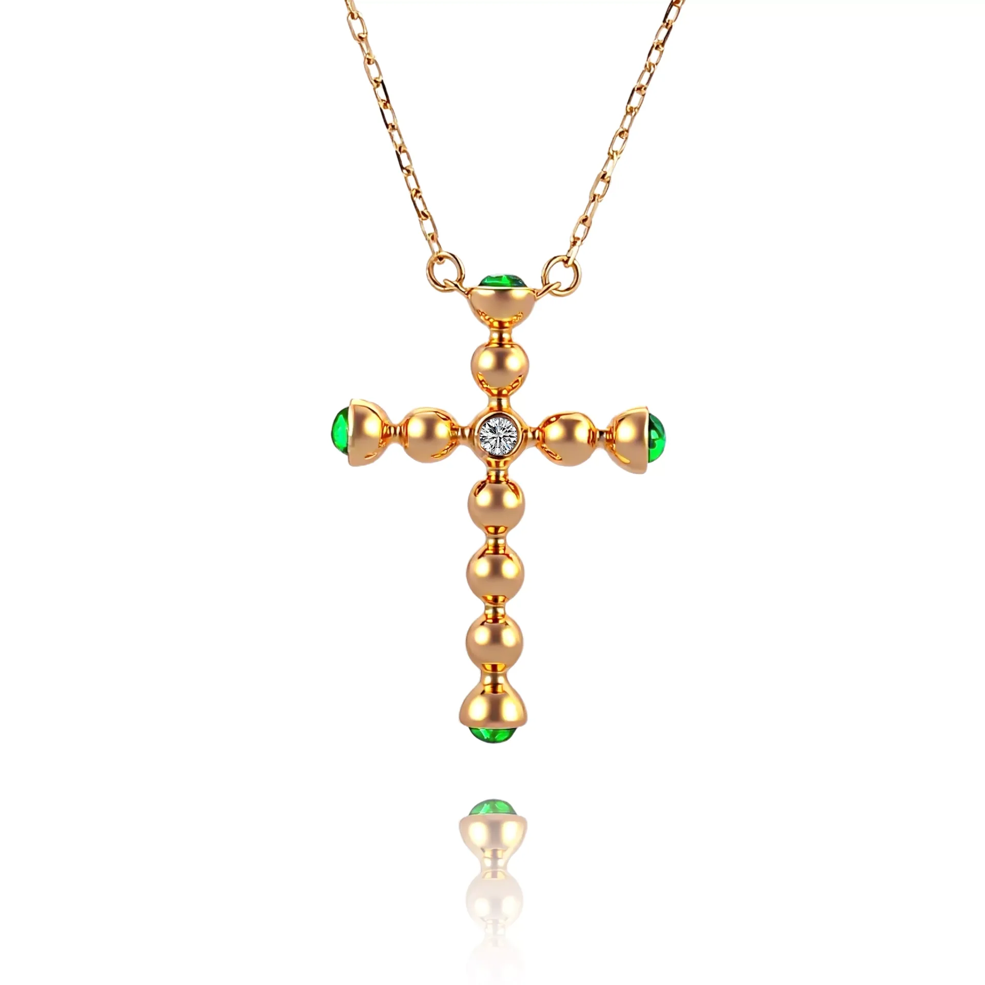 Large Statement Emerald and Diamond Cross Necklace | 18k Yellow Gold Beaded Design