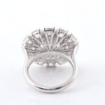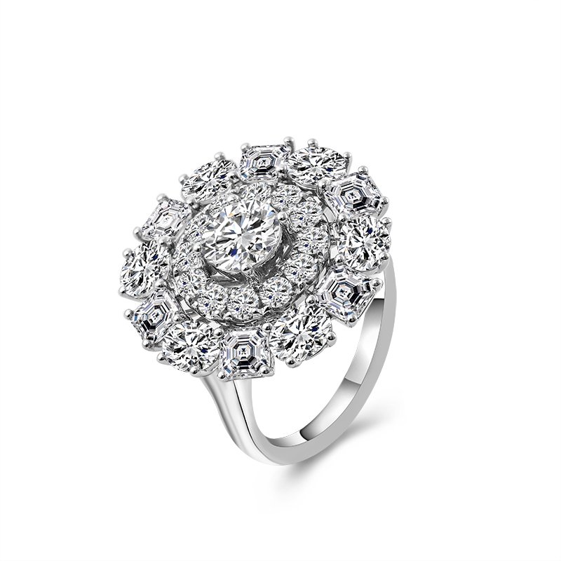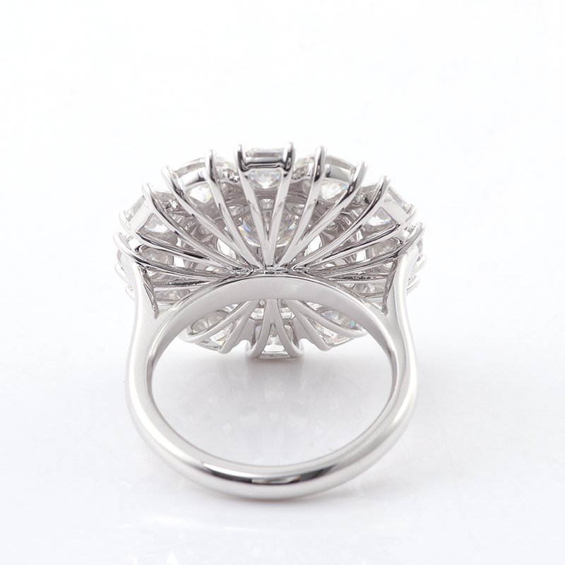 This luxury moissanite engagement ring features 3 shapes of moissanites: round, oval and asscher.The unique design makes it can be a high-light of your outlook!