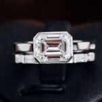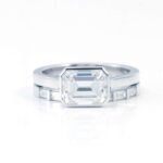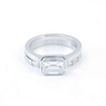 This Emerald Cut Moissanite Ring showcases a VVS clarity emerald cut moissanite as the centerpiece, set in high quality white gold. The refined emerald cut of the moissanite, complemented by the sleek white gold band and the small baguette cut moissanites on the sides, creates a sophisticated and luxurious look. It’s a perfect choice for those who appreciate timeless elegance and want to make a bold fashion statement.