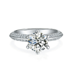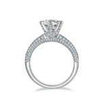 The beautiful Moissanite engagement ring features a petite knife edge design, a round cut 3ct 9mm Moissanite centre stone with 180 accent diamonds paving around the half way of each shoulder. This moissanite engagement ring is dreamlike.