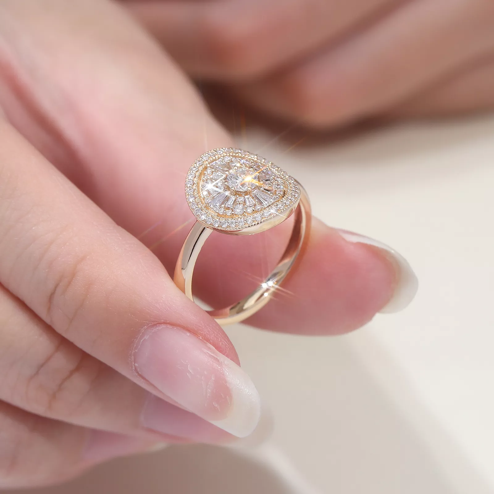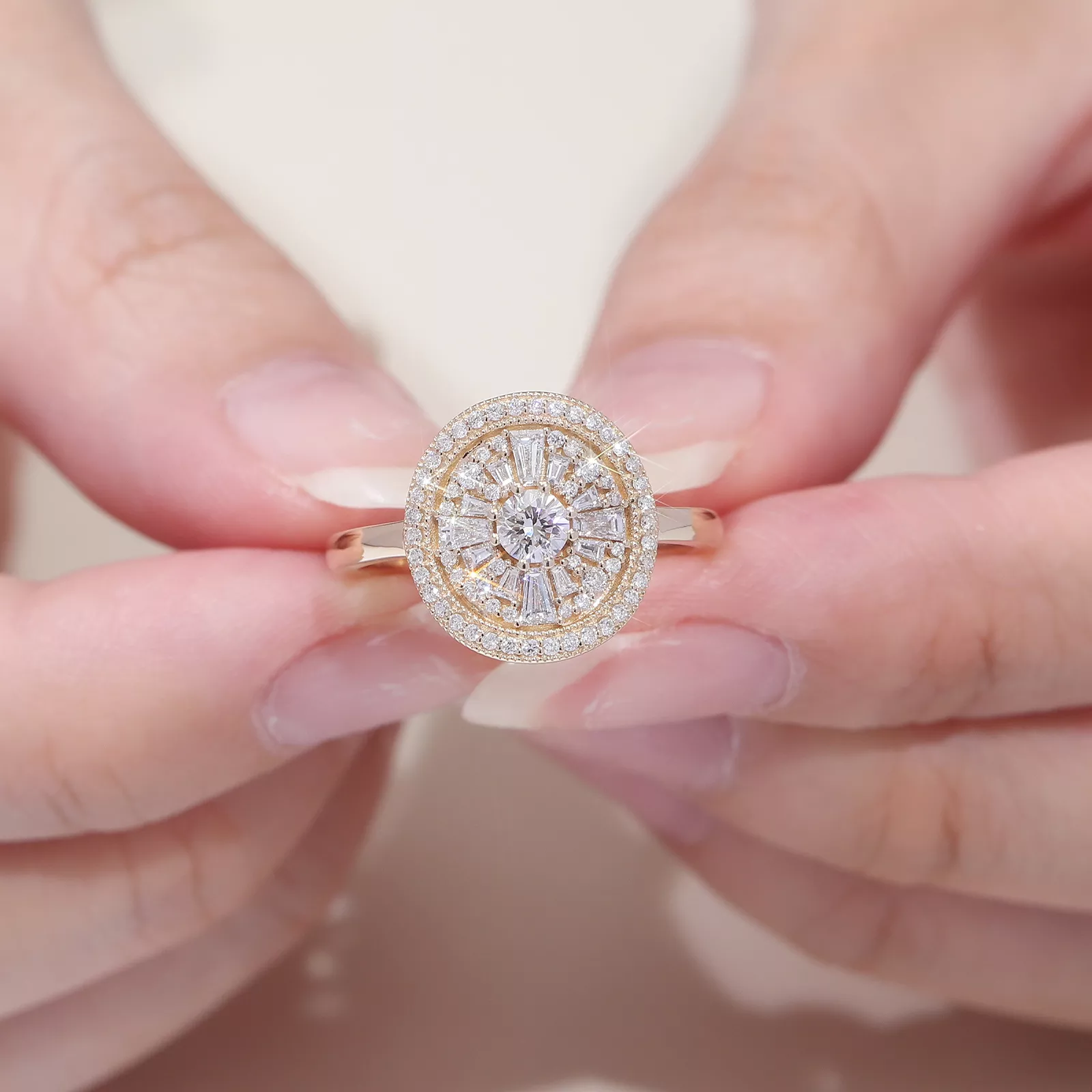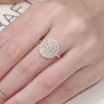 This Multilayer Moissanite Halo Ring centers on a ​prominent round-cut moissanite​ encircled by two radiating tiers: an inner halo of ​​moissanite set diagonally, surrounded by an outer perimeter of moissanite​. The stones ascend toward the central gem, creating ​​three-dimensional depth and layered luminosity​​. Crafted to transform light into geometric poetry with every movement.