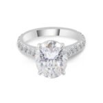 This classic, elegant ring has one oval brilliant cut moissanite diamond and a number of remaining round moissanite diamonds set in an elegant bezel. This ring is the perfect wedding or anniversary band.