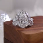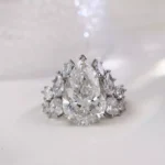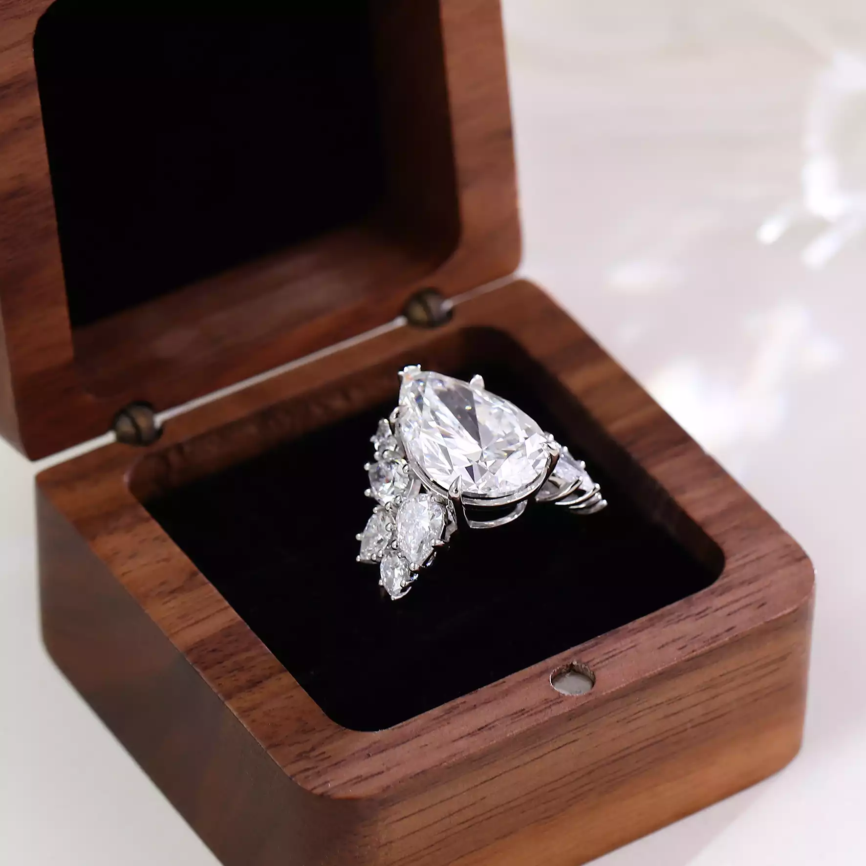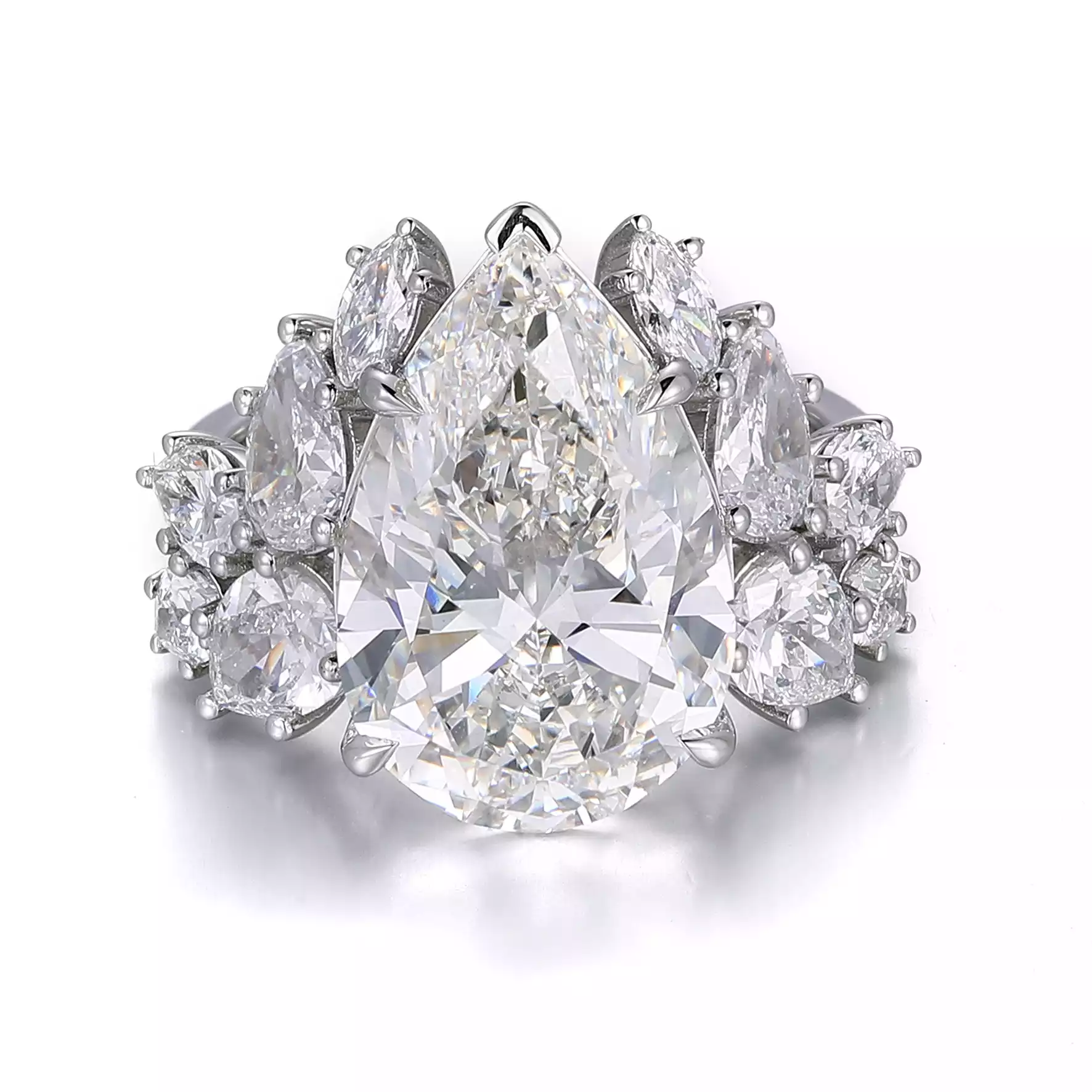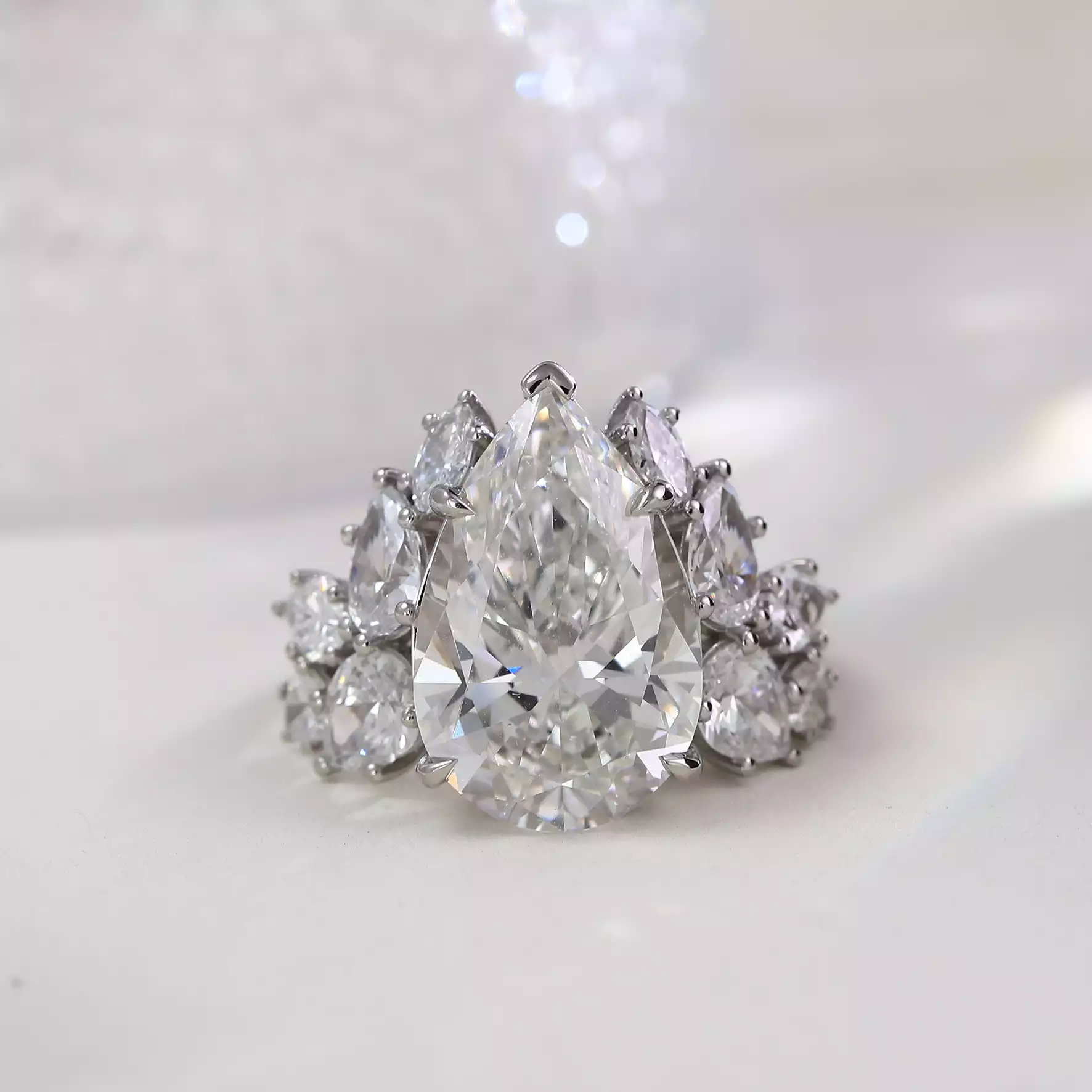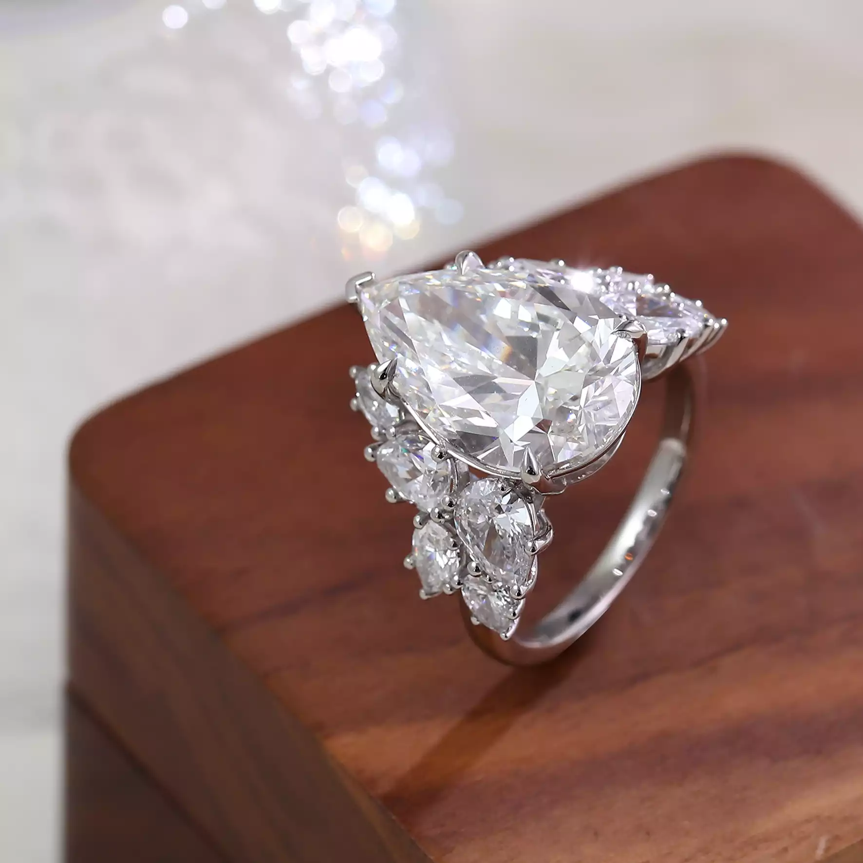 Admire the grandeur of this Pear-Shaped Cluster Engagement Ring, boasting a large pear-shaped center stone surrounded by smaller Moissanite. The unique cluster design adds a touch of elegance and sparkle, making it a statement piece for any special occasion or proposal.