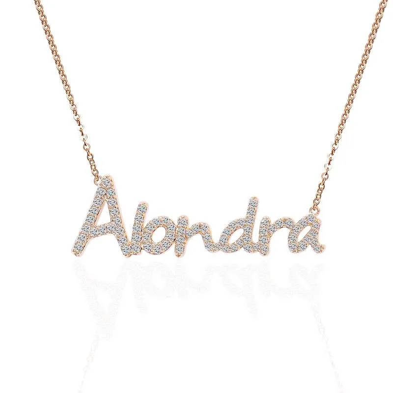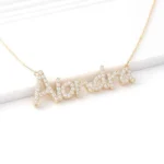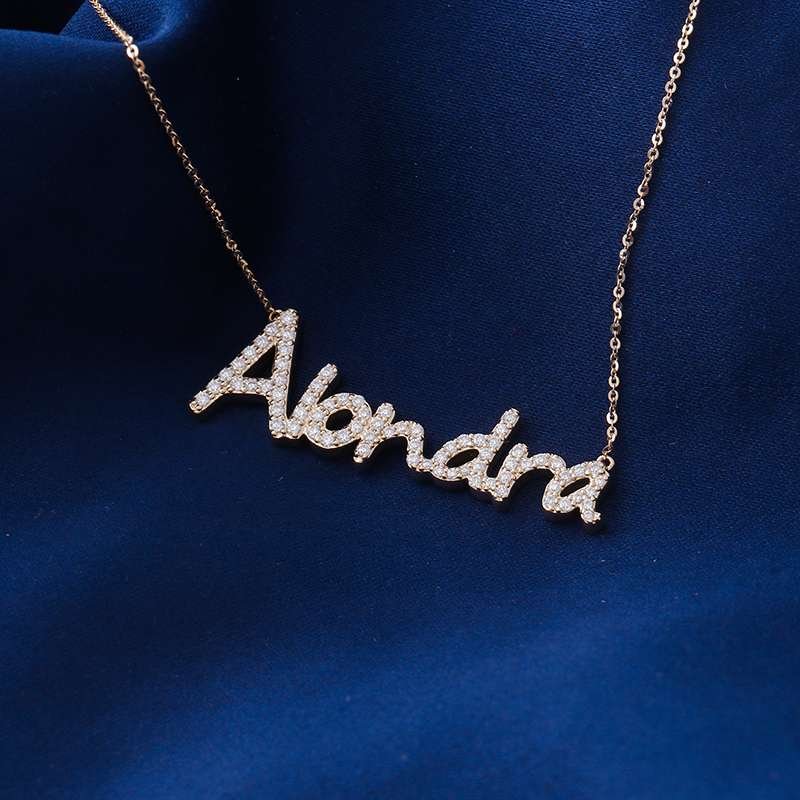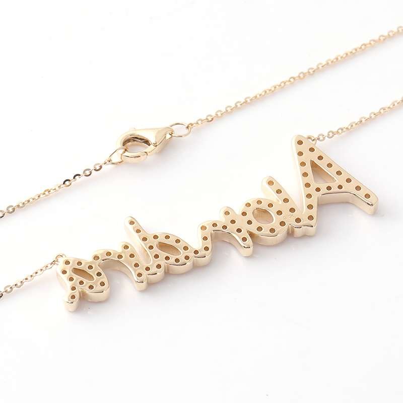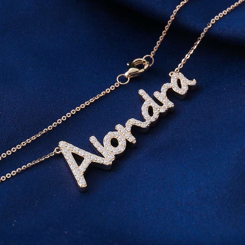 Celebrate individuality with our personalized nameplate necklace, showcasing your unique style with a custom name pendant adorned with sparkling moissanite. This 18-inch chain necklace adds a touch of elegance to any outfit, making it a perfect gift or statement piece.