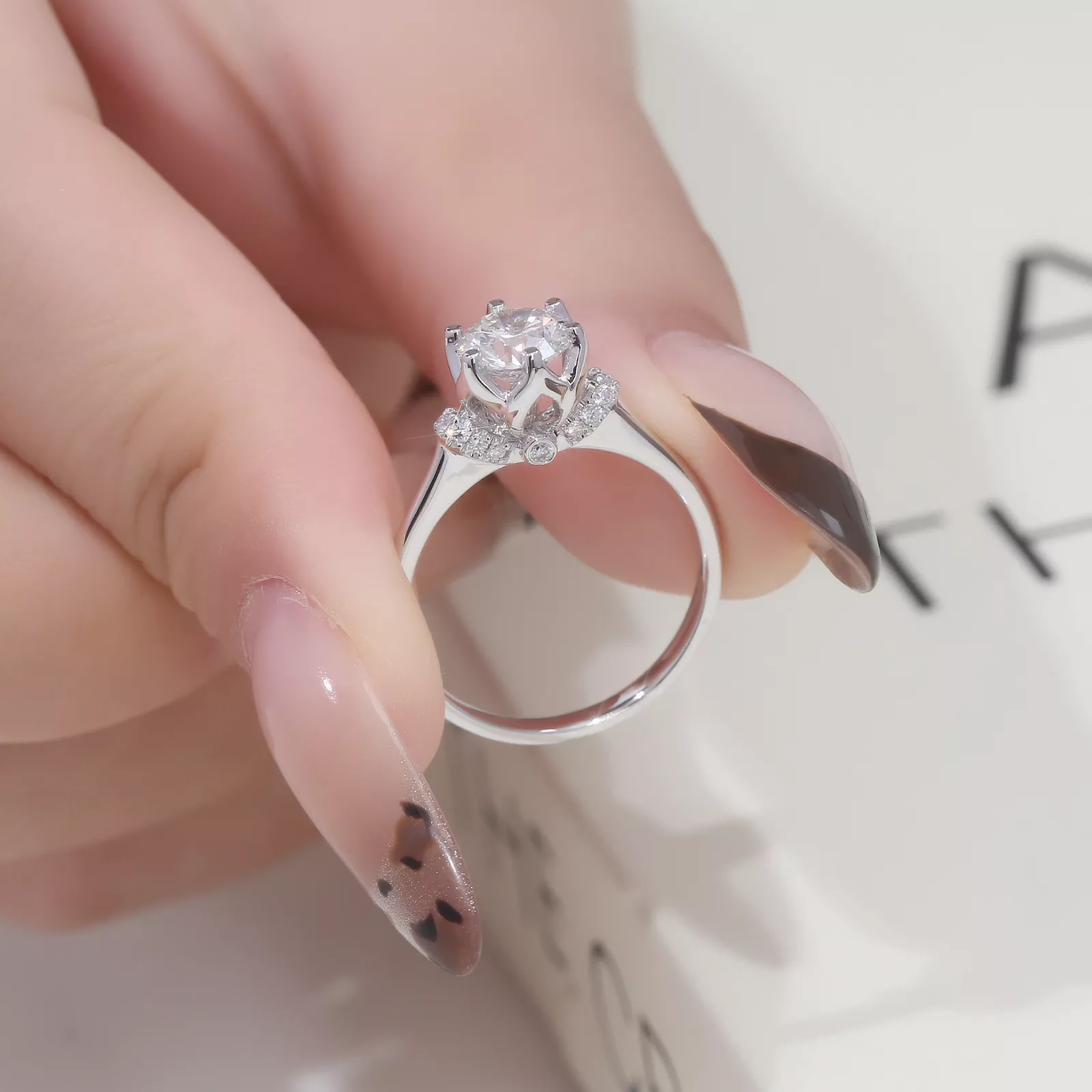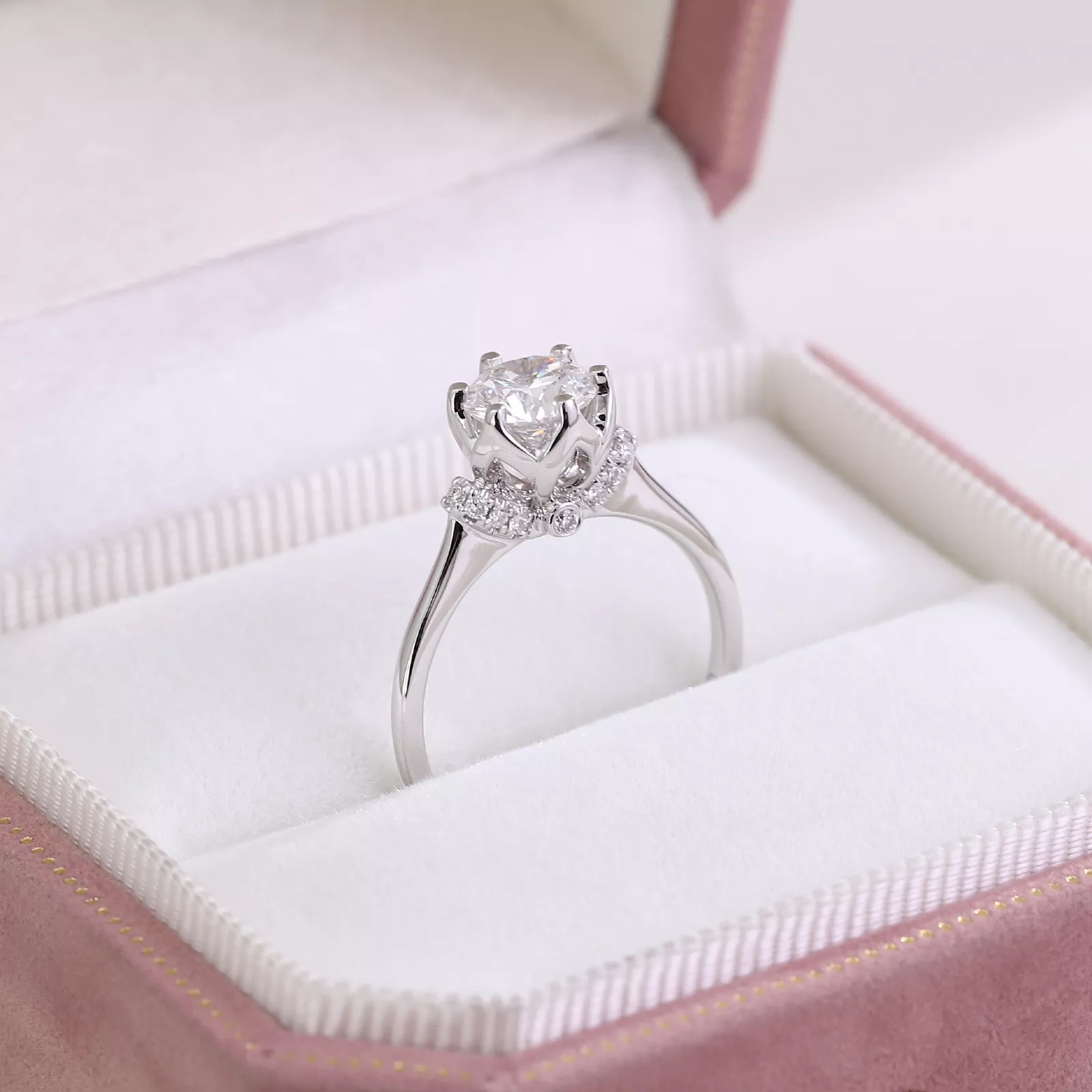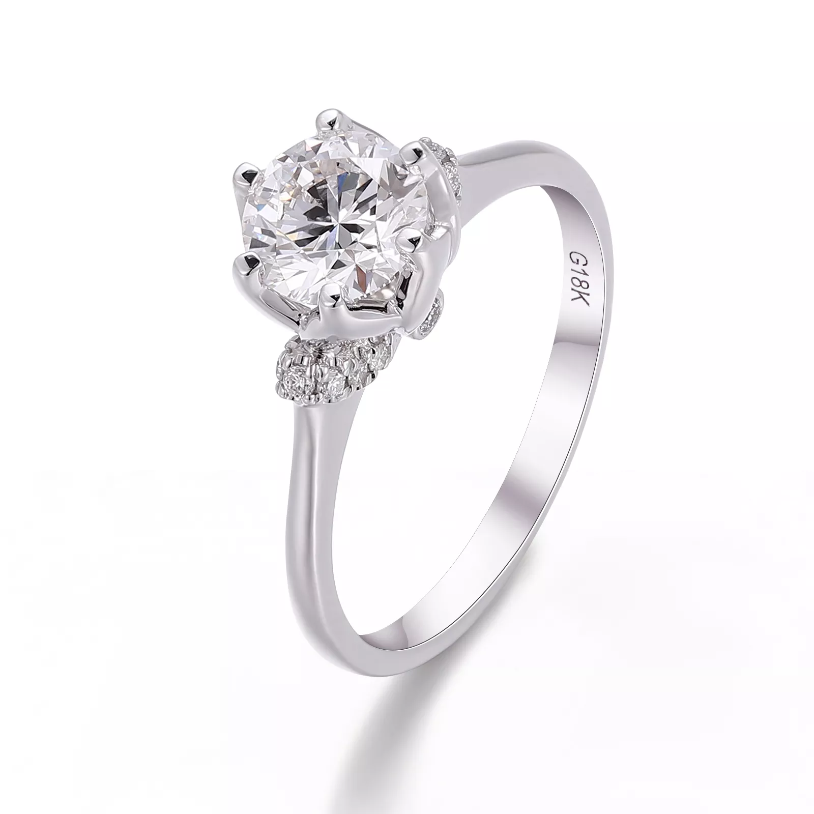 Round Moissanite Ring commands focus through its central radiant moissanite, cutting prismatic light trails across precisely angled facets. A constellation of micro-scale accents encircles the primary stone, refracting secondary luminescence like cosmic dust around a star. The streamlined setting elevates the gem above vanished metal architecture.Stark white void amplifies the dynamic light interplay — where disciplined geometry merges with liberated brilliance for elemental magnetism.