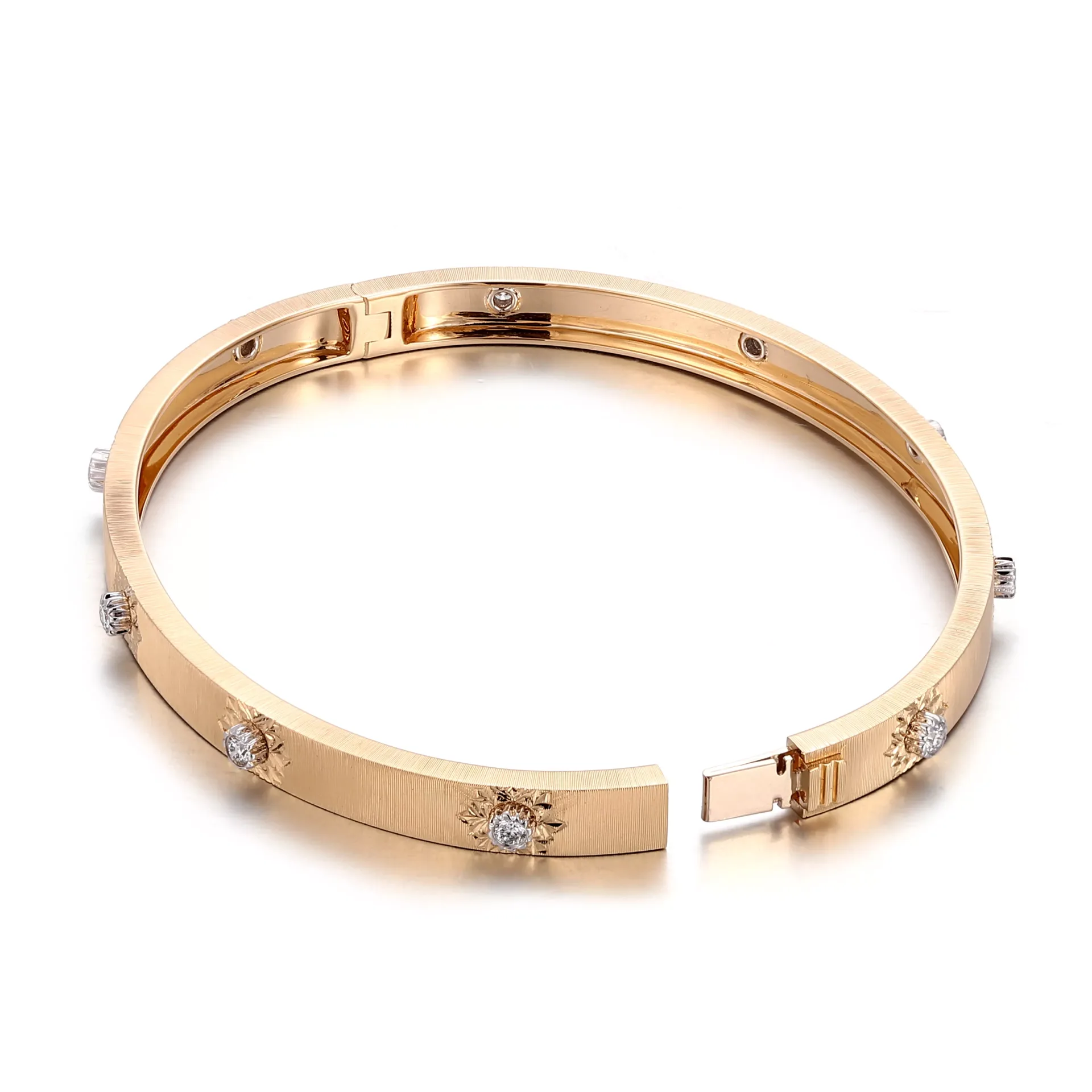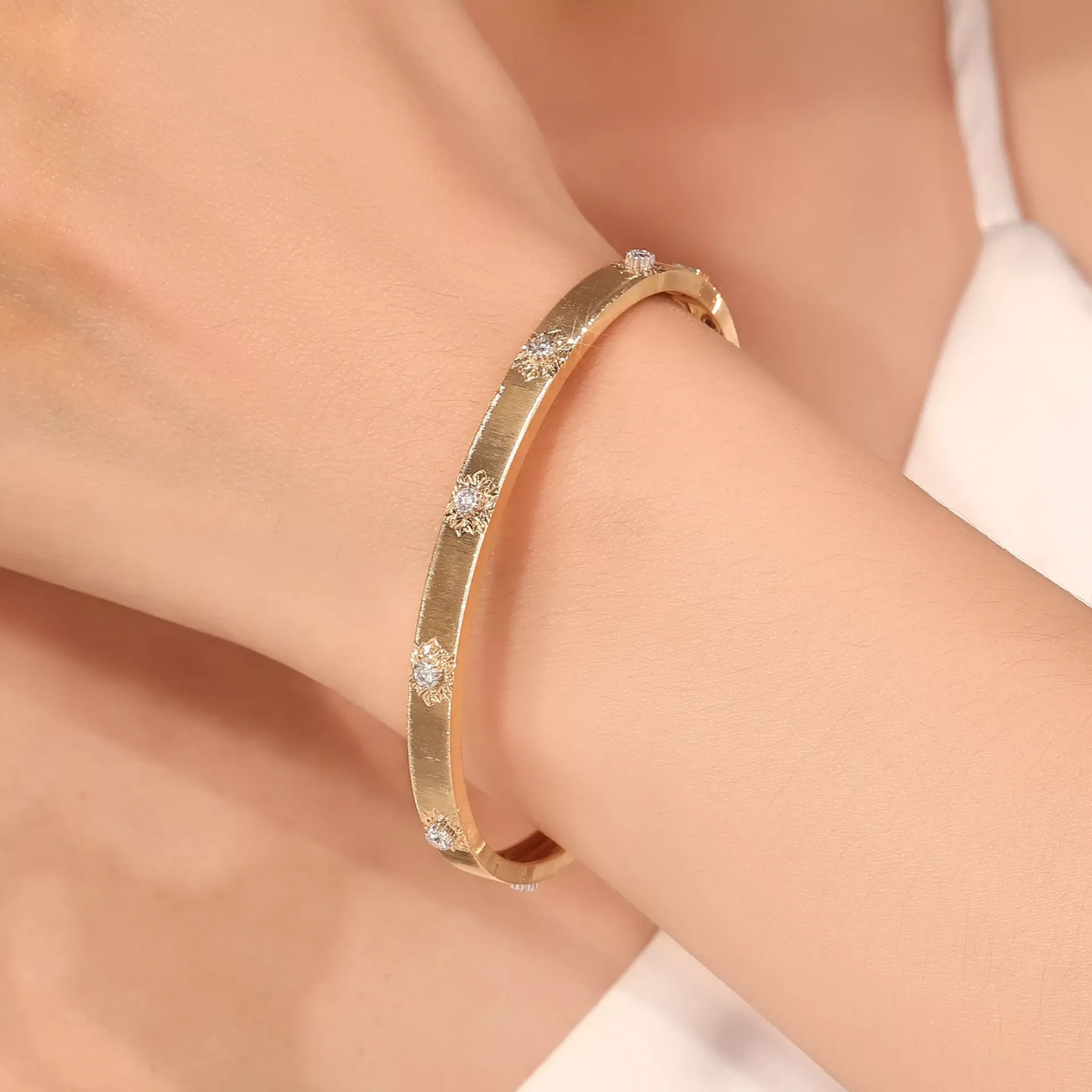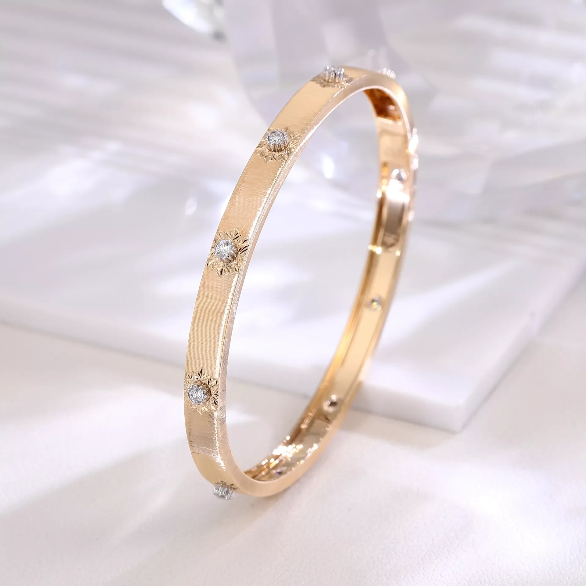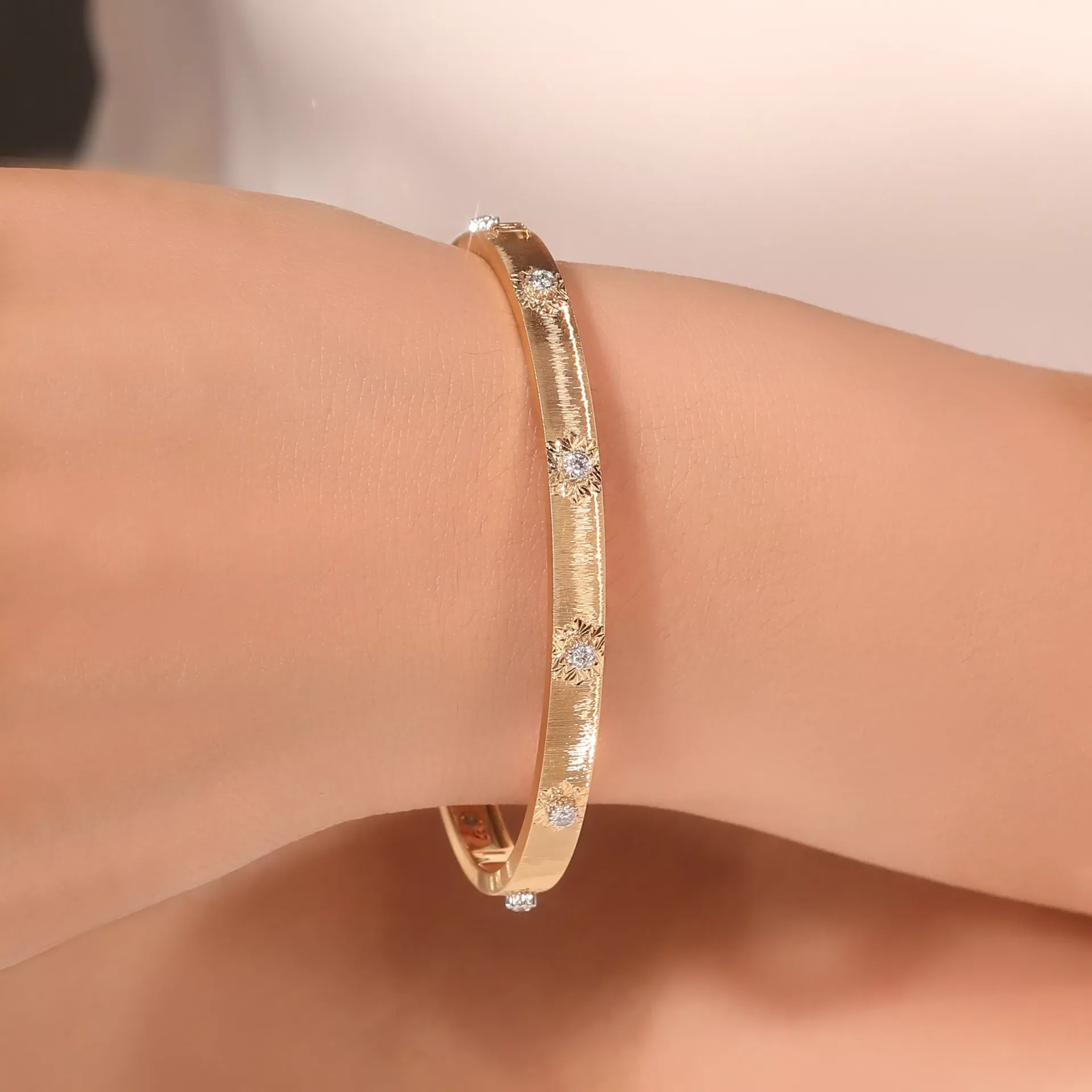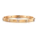 This 18K Flat Band combines a brushed finish with strategically placed polished star-shaped settings, each securing a round-cut lab diamond. The diamonds are spaced evenly along the bracelet’s outer curve, creating a rhythm of brilliance against the warm, textured gold. The interior features a smooth, rounded fit, ensuring comfort against the skin. This piece merges minimalist elegance with precision craftsmanship — where light dances between matte surfaces and diamond fire, embodying modern luxury for everyday wear.