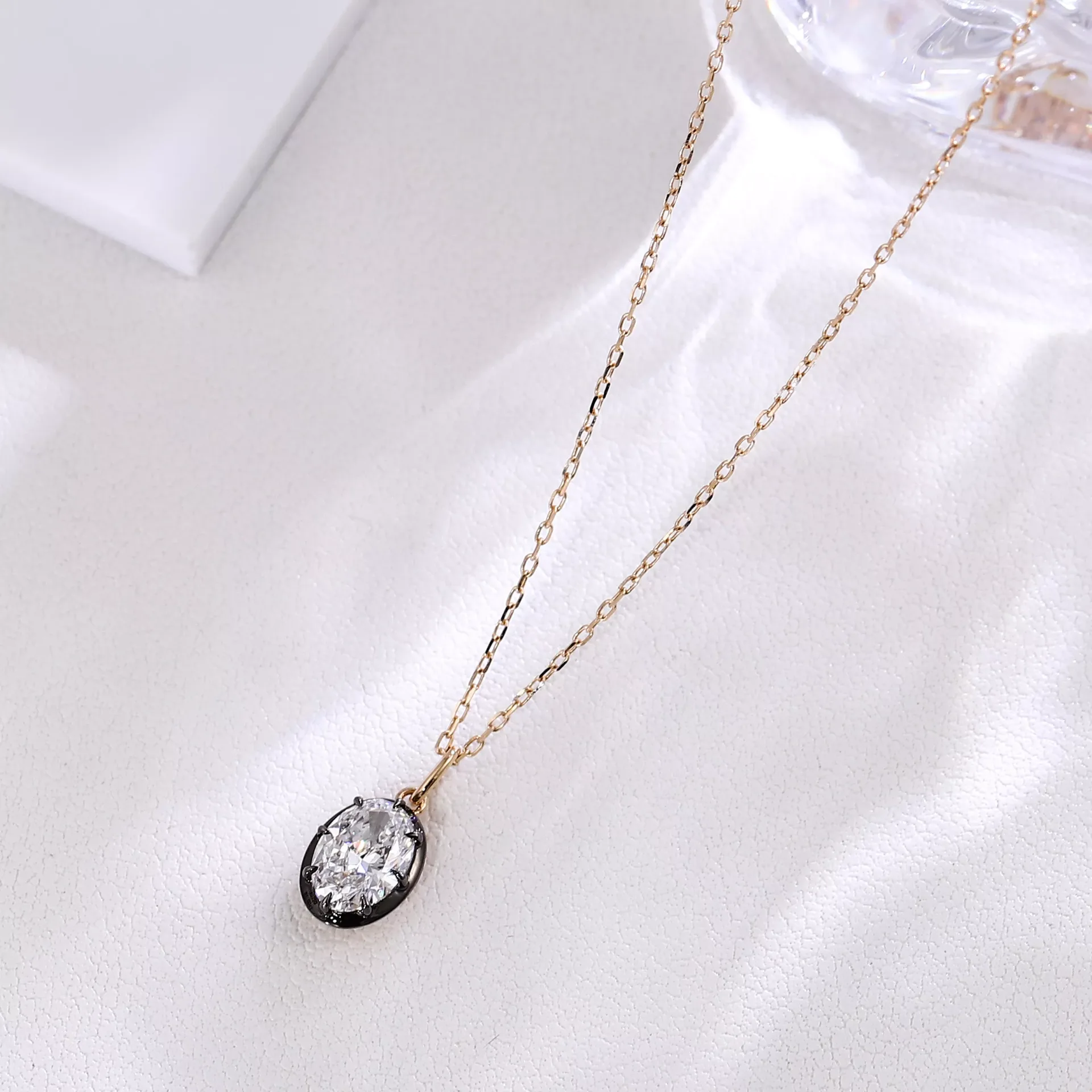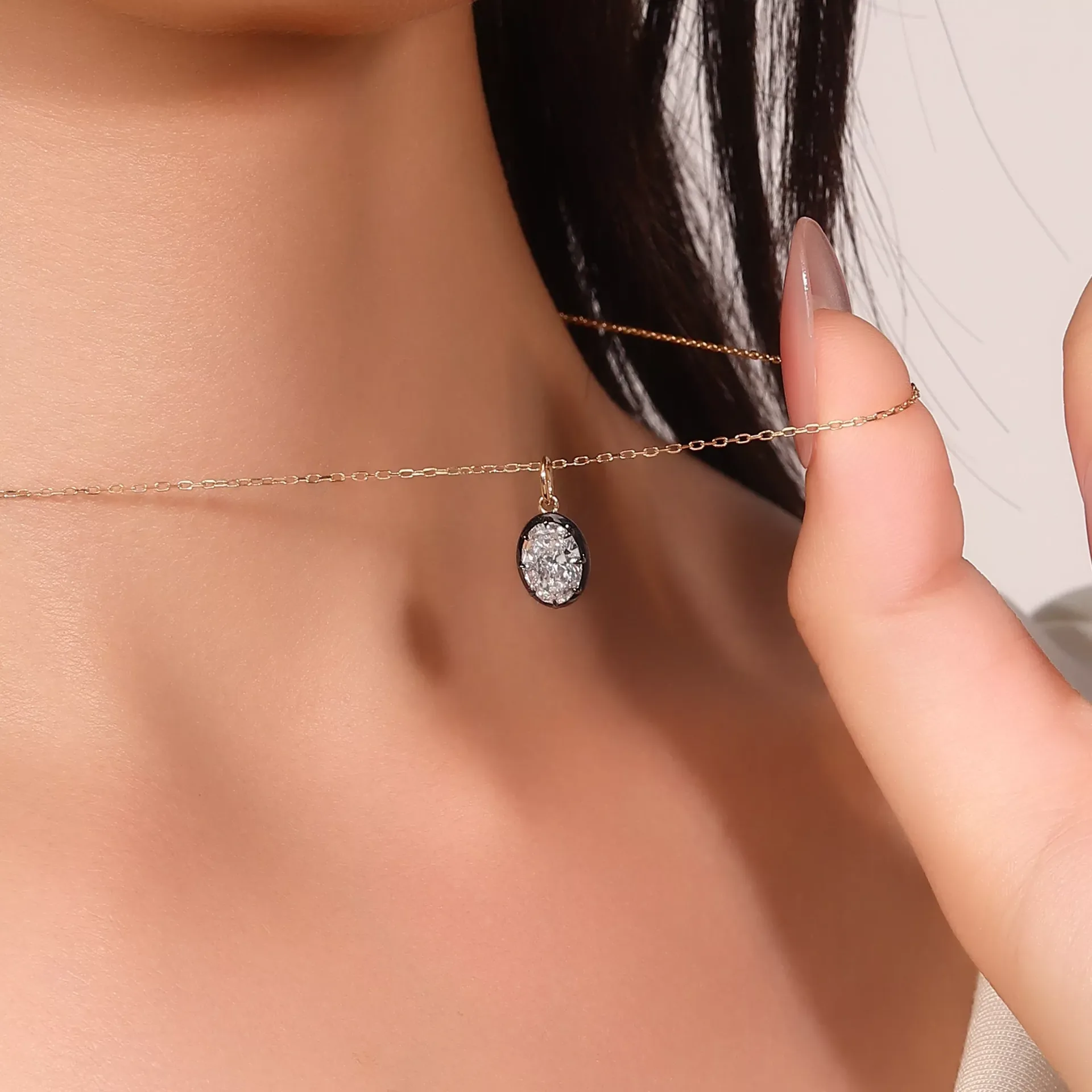 The Radiance Solitaire Pendant centers a prominent oval-cut lab diamond, secured by dramatic black prongs that create a striking visual contrast against the warm 18K yellow gold framework. The diamond’s facets refract soft, continuous light. It emphasizes minimalist elegance through the interplay of icy diamond brilliance and the gold’s luminous warmth. A modern testament to ethical luxury and refined craftsmanship.