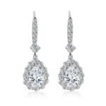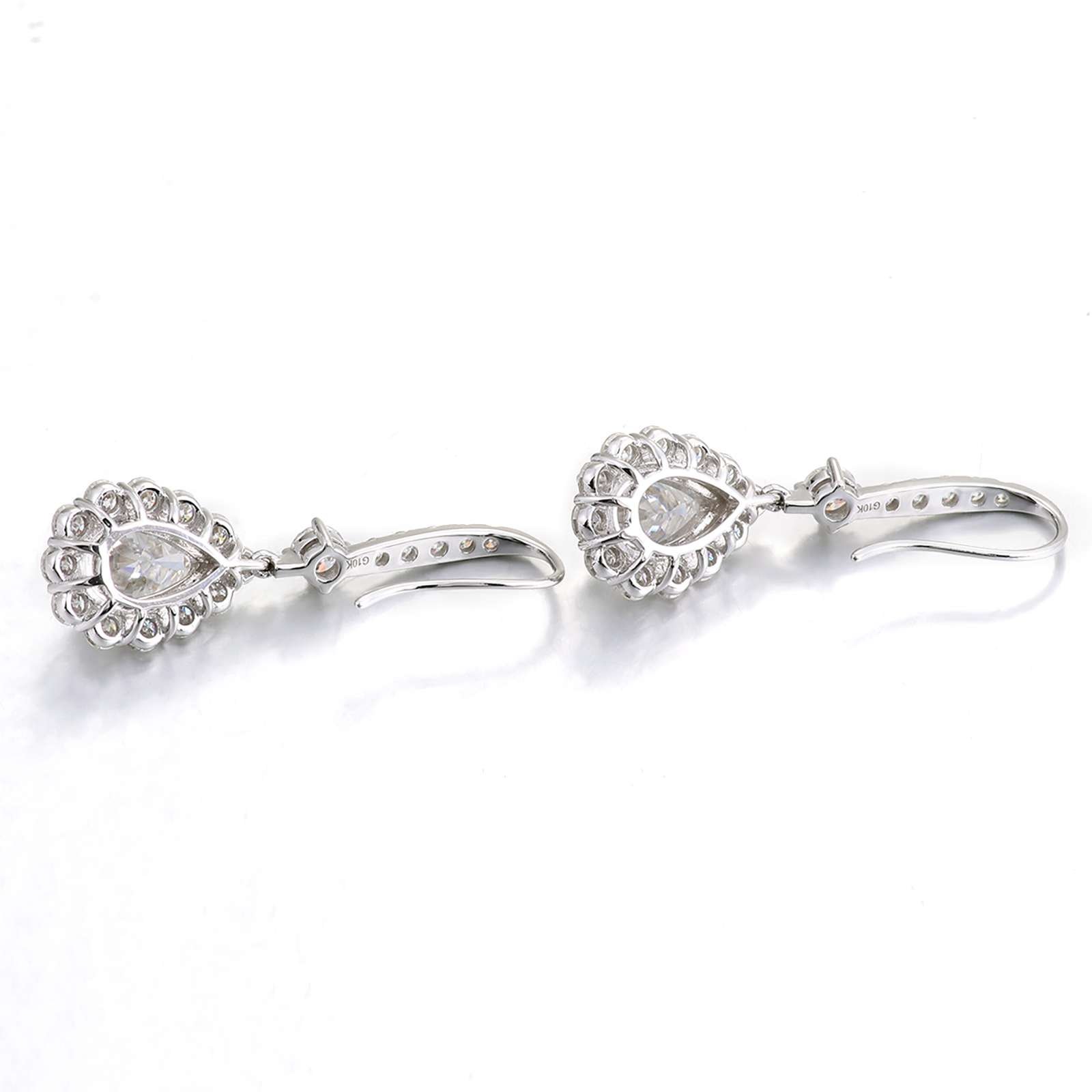 Elevate your style with these breathtaking Pear Cut Moissanite Drop Earrings, crafted in 10k White Gold. Each earring features a stunning 6x9mm teardrop moissanite as the main stone, surrounded by a glittering halo of smaller moissanite stones. The design includes a total of 24 additional 2.5mm moissanite stones, enhancing the central teardrop’s brilliance. These earrings, measuring 33mm in length and 10mm in width, are perfect for adding a touch of elegance to any outfit.
