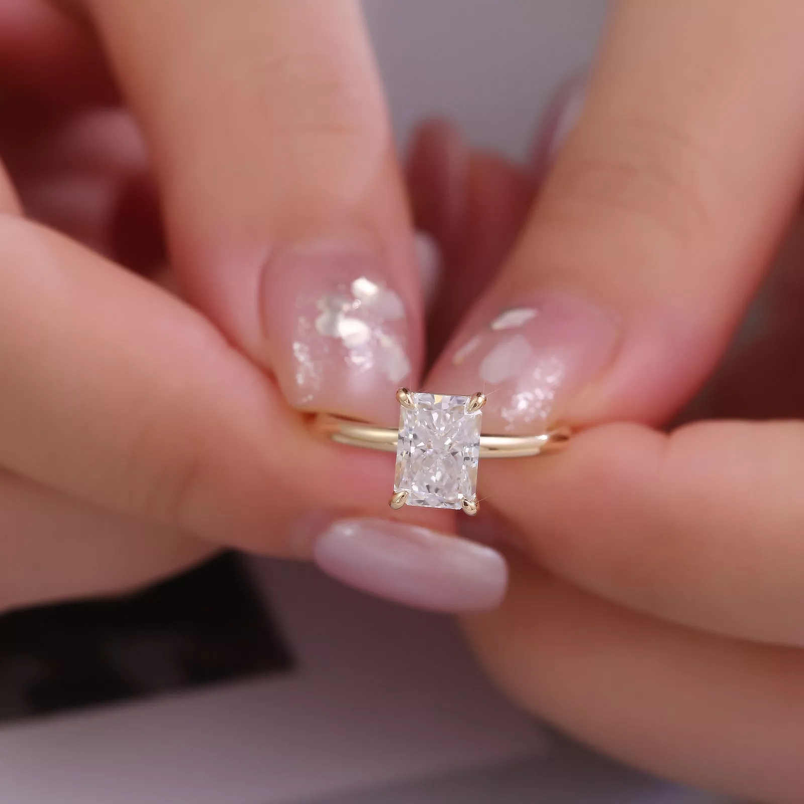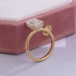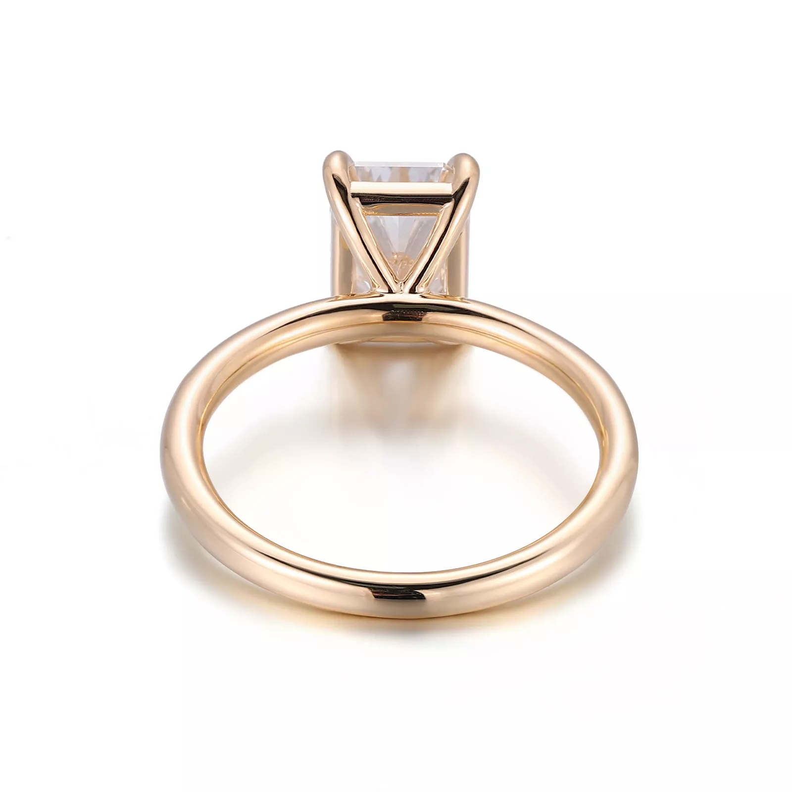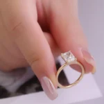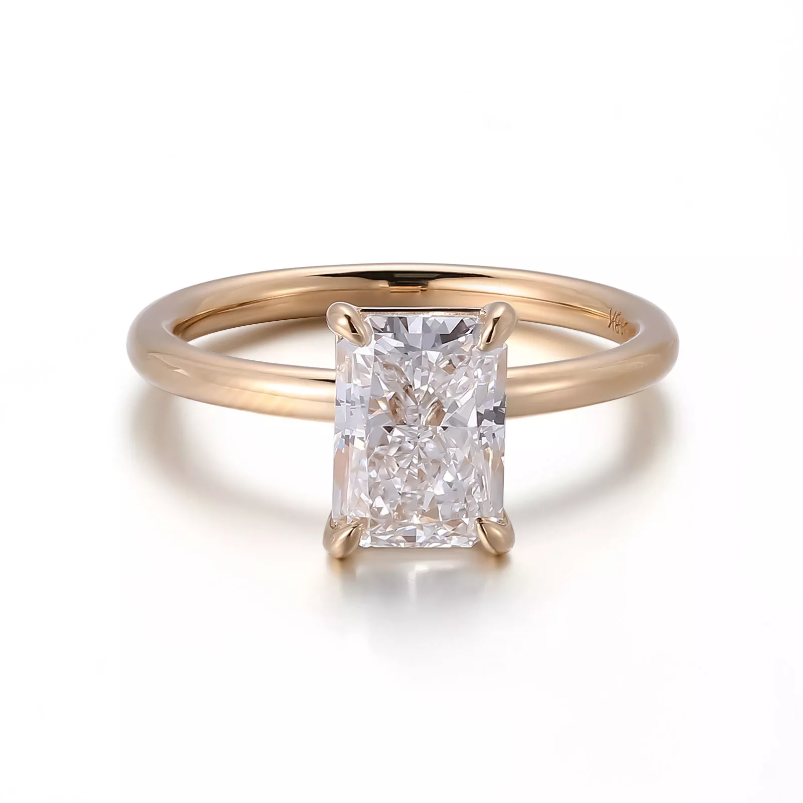 The Radiant-Cut Moissanite Solitaire Ring features a radiant-cut moissanite set in a classic four-prong solitaire setting crafted from warm gold. The moissanite’s precise facets refract vibrant fire and brilliance, showcasing its icy-white scintillation against the metal’s luminous hue. The ring’s streamlined band tapers gently toward the stone, emphasizing its minimalist elegance and ensuring a comfortable fit.