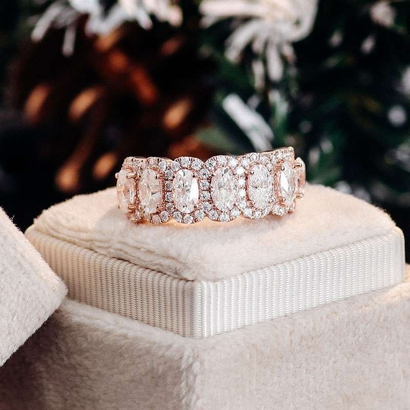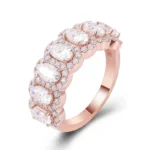 This magnificent rose gold Oval Cut Ring is a true embodiment of opulence and sophistication. Featuring moissanite stones of VVS clarity, expertly cut in an oval shape, it exudes a captivating sparkle. The oval cut moissanite at the center is surrounded by a halo of smaller moissanite stones, enhancing its brilliance and creating a mesmerizing effect. The warm tone of the rose gold beautifully complements the cool sparkle of the moissanite, resulting in a harmonious and elegant design. Suitable for any special occasion, this ring is a perfect addition to your jewelry collection, making a bold statement of style and luxury.
