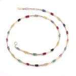 This 18K yellow gold Rainbow Gemstone Symphony Necklace showcases a vibrant array of natural gemstone beads meticulously strung in a rhythmic color sequence: deep red, blush pink, royal purple, sky blue, forest green, sunny yellow, and bold black. Each gemstone is polished to a smooth, luminous finish, contrasting with the warm, polished gold links that connect them. This piece celebrates nature’s palette through ethical sourcing and masterful goldsmithing — where each gemstone’s unique hue tells a story of earthly elegance.