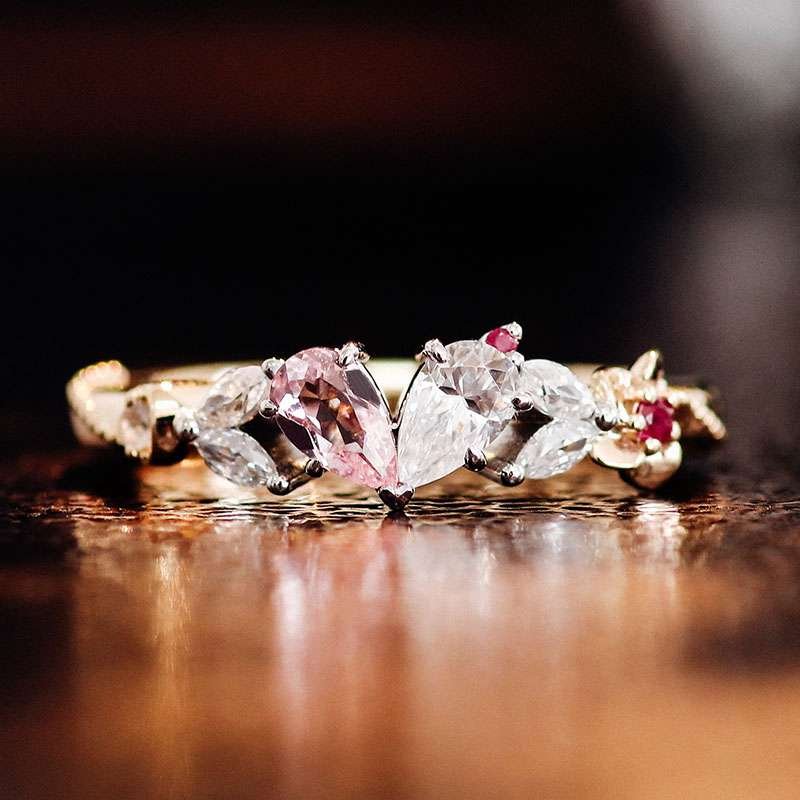 Step into a world of romance with this enchanting yellow gold Lab Gemstone Ring. It features a captivating blend of moissanite and lab created gemstones. The heart shaped stones in pink and clear hues, along with the delicate accents of other gemstones, create a whimsical and romantic look. Crafted from high quality yellow gold, this ring is not only a piece of jewelry but a statement of love and individuality. Ideal for those who seek a unique accessory that stands out from the crowd.