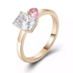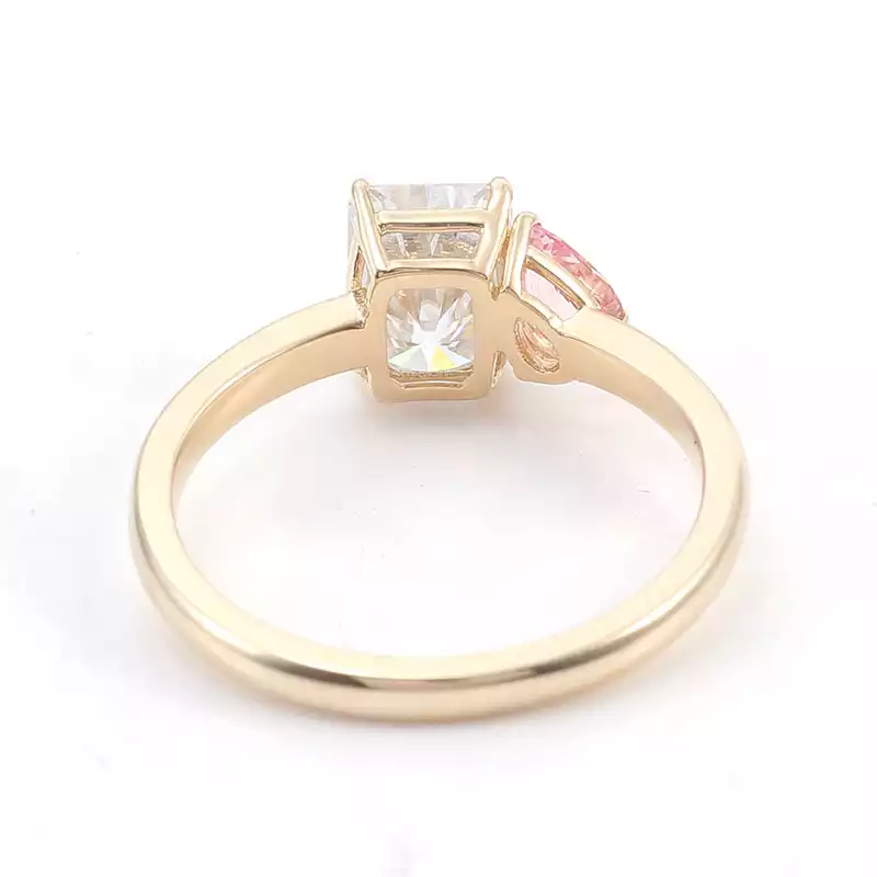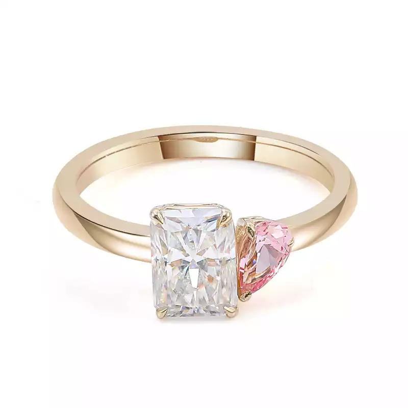 Express your love with our romantic colorless and pink moissanite toi-et-moi ring. This captivating piece features a radiant rectangular-cut colorless moissanite accompanied by a charming heart-shaped pink moissanite, both set in a polished yellow gold band. The perfect blend of elegance and sentimentality, this ring is an ideal choice for engagements, anniversaries, or as a heartfelt gift.