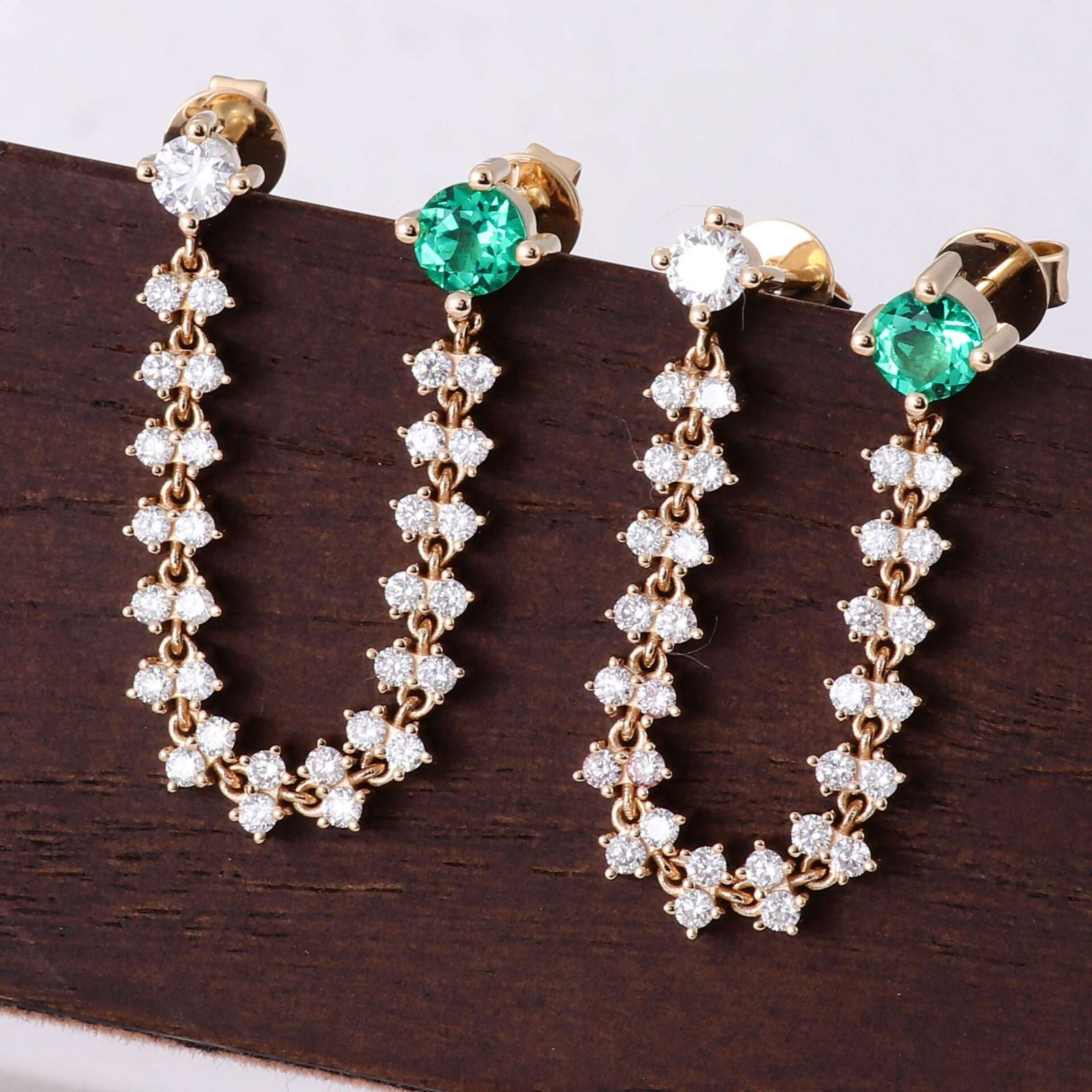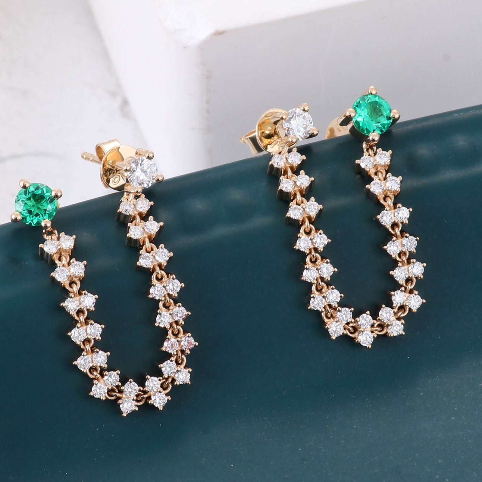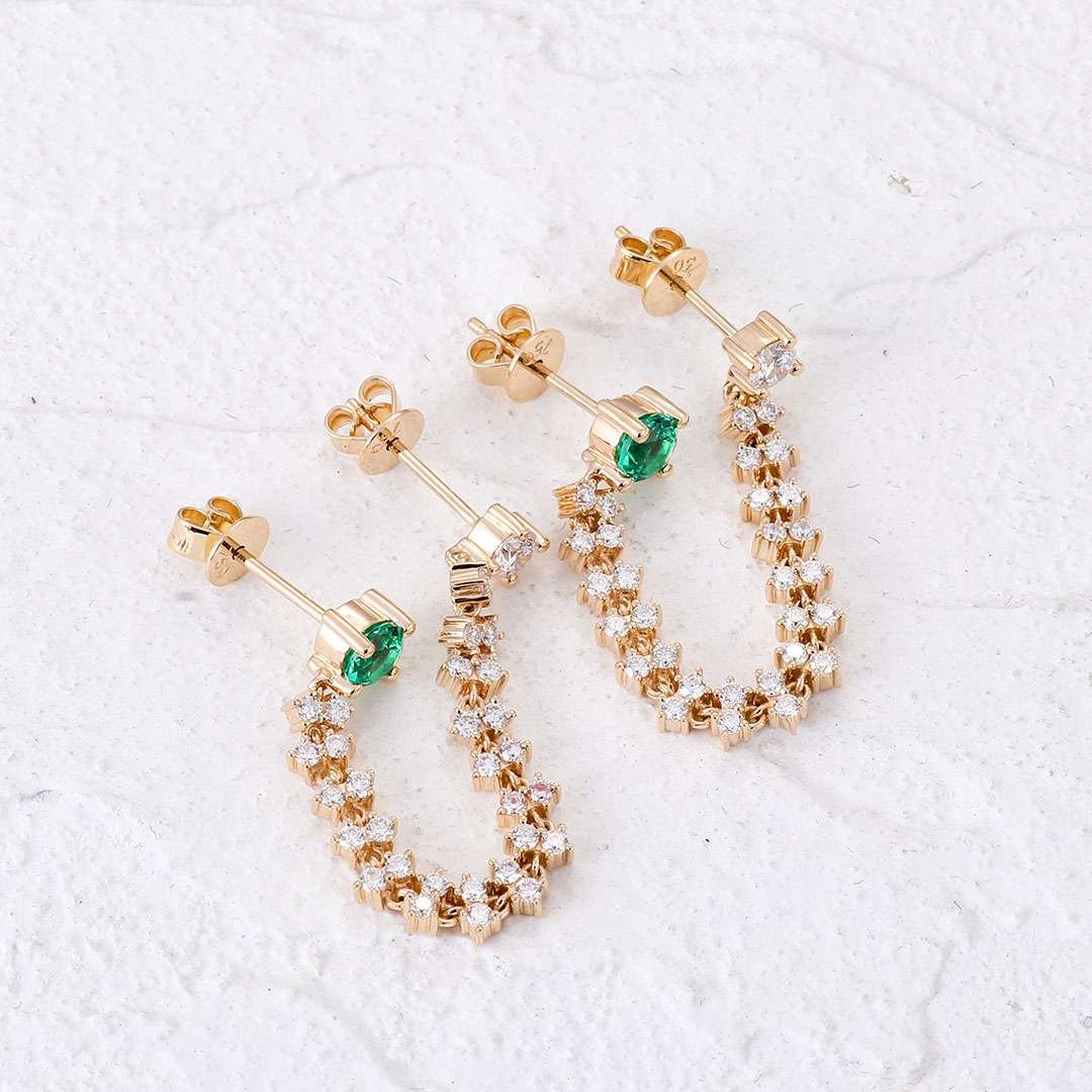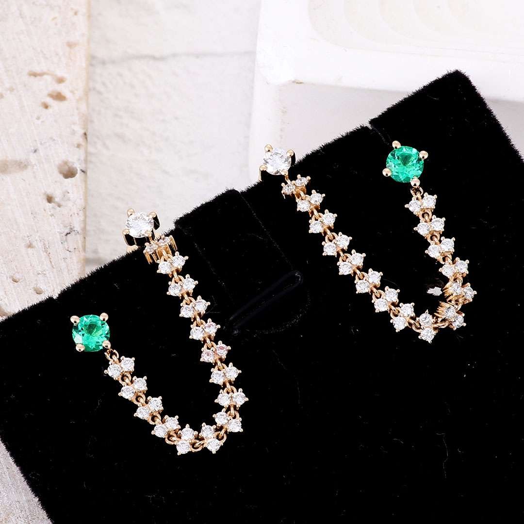 Elevate your elegance with our exquisite Round Emerald Gemstone and Colorless Diamond Chain Earrings. Each earring features a captivating round emerald green gemstone at one end and a dazzling colorless round diamond at the other. The chain is gracefully connected by 15 groups of two brilliant diamonds, creating a stunning cascade of sparkle and color. Perfect for adding a touch of sophistication and glamour to any ensemble, these earrings are a true statement of luxury and refined style.