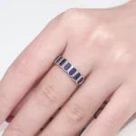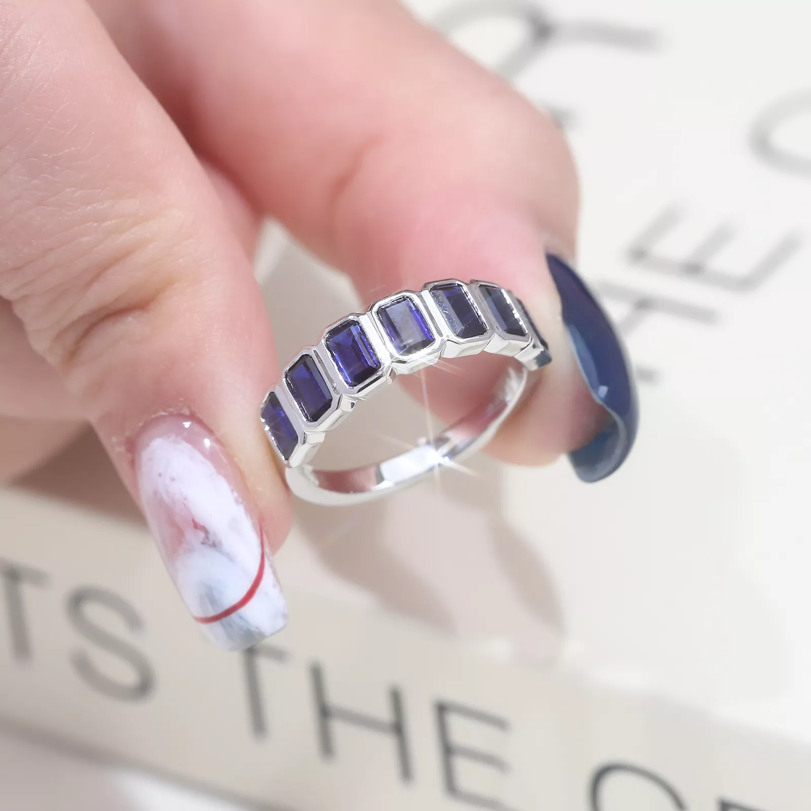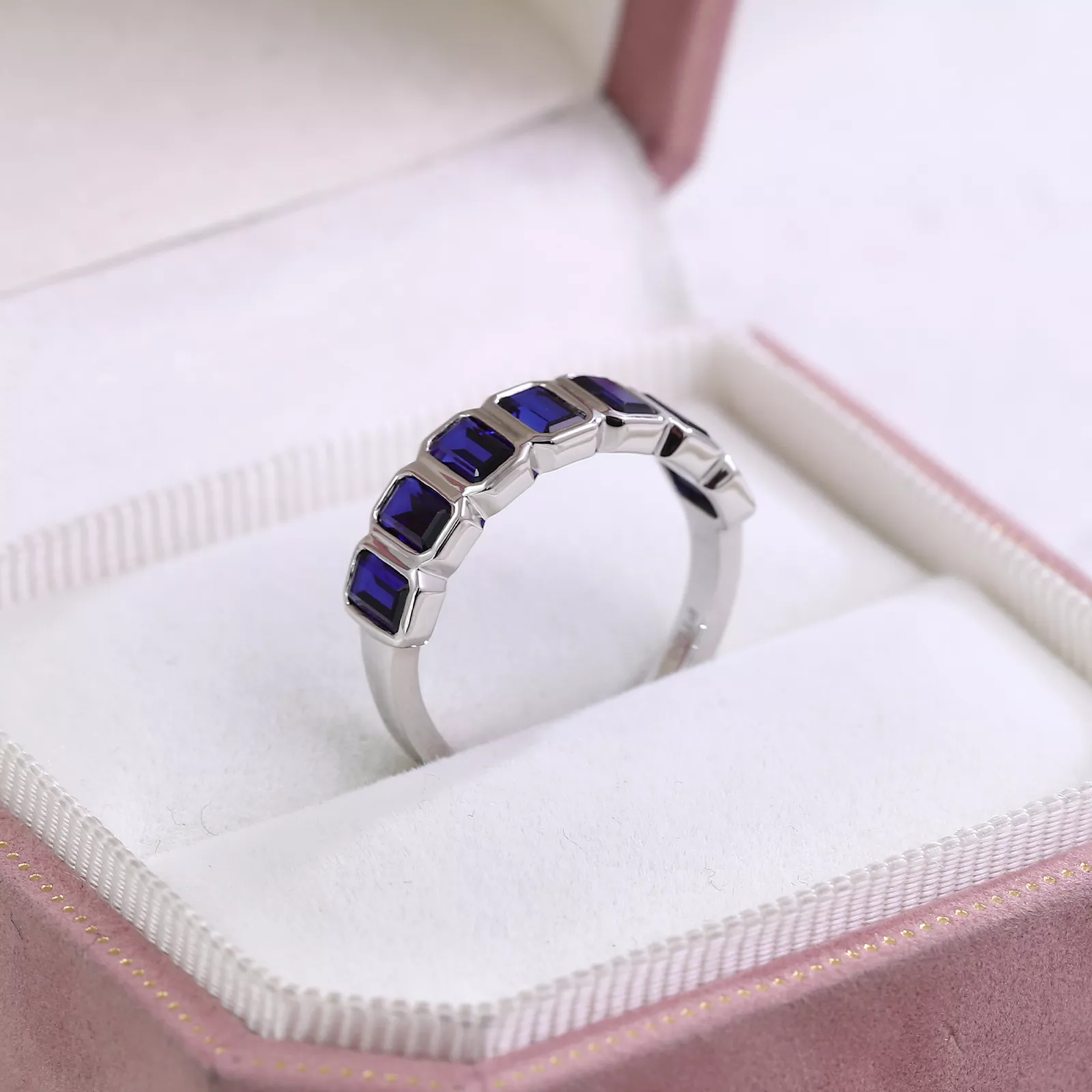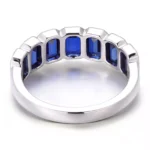 Royal Blue Emerald Cut Ring showcases seven vivid lab-created gemstones in precision emerald cuts, channel-set in a sleek platinum band. Each saturated royal blue stone reflects crystalline depth while platinum’s cool tone enhances the gems’ ethereal glow. A harmonious union of modern science and eternal elegance for refined moments.
