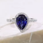 Royal Blue Pavé Ring centers a deep cerulean pear-cut lab gemstone, embraced by pavé-set moissanites. The entire band shimmers with frost-like micro-moissanites, creating seamless light refraction against sterling gold. This ethical design transforms royal saturation and icy brilliance into geometric elegance – where scientific alchemy meets uncompromised luxury for statement occasions.