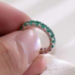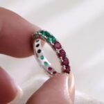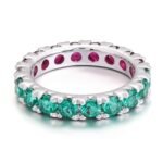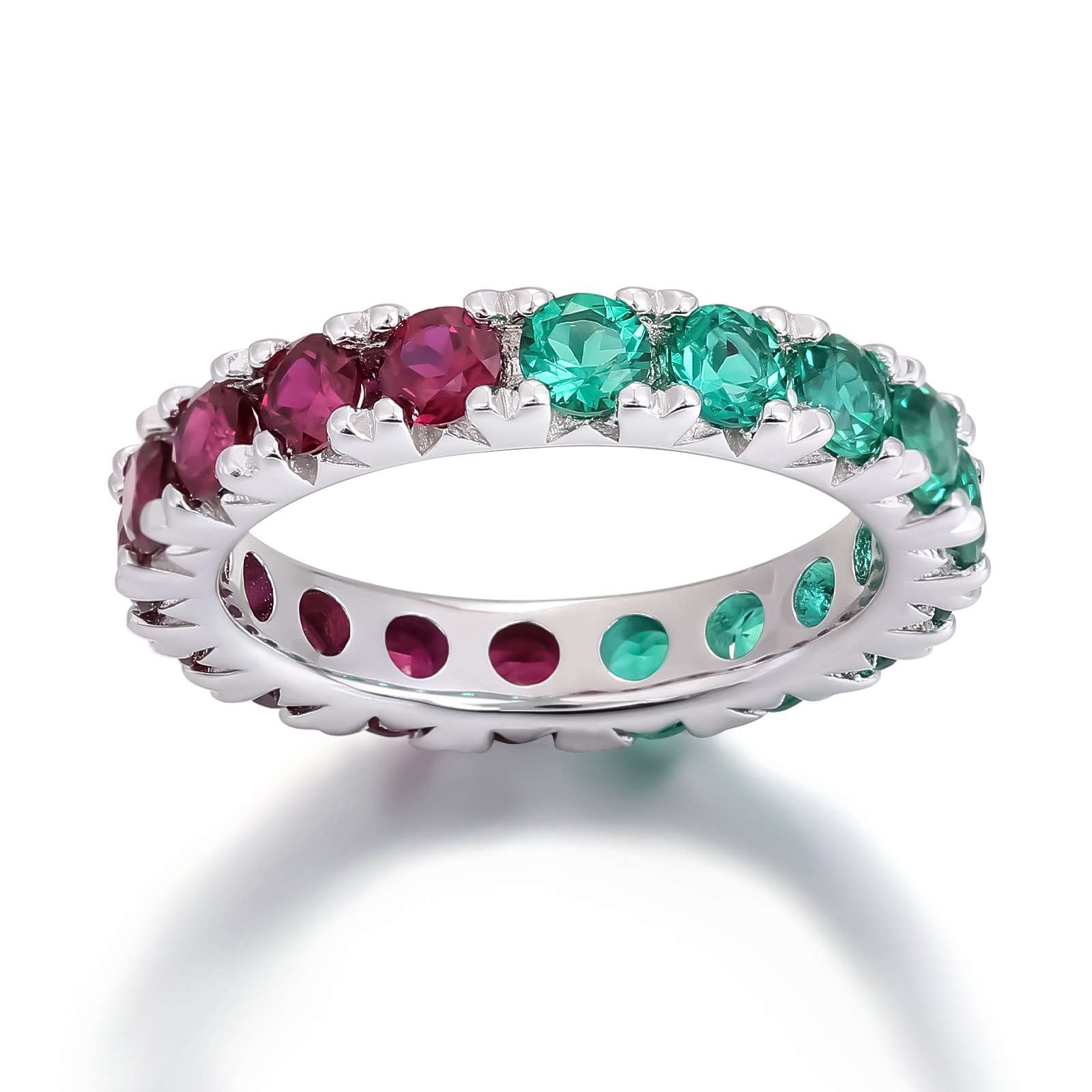 Admire the vibrant colors of this stackable eternity ring, showcasing alternating round ruby and emerald lab gemstones. The 3mm rubies and Zambian emeralds create a striking contrast against the 18K-Gold setting, making it an eye-catching accessory for any occasion. With a width of 3.3mm and thickness of 2.6mm, this ring is both comfortable and stylish.