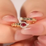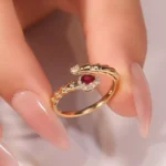 The Coiled Serpent Ring sculpts a coiled serpent in 18K yellow gold, its body adorned with micro-pavé lab diamonds that trace the sinuous curves. The serpent’s head features a prominent pear-cut ruby, prong-set to showcase its deep red hue, while the eyes are accented with round lab diamonds for a piercing gaze. The band wraps elegantly around the finger, with textured scales and a polished interior for comfort. This piece merges symbolic power with ethical luxury — where the serpent’s ancient mystique meets modern gemstone brilliance.