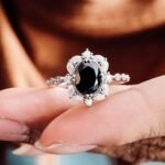 This captivating white gold moissanite halo ring is a harmonious blend of luxury and style. At its core is a VVS clarity oval cut black moissanite, exuding a mysterious and alluring charm. Surrounding the central stone is a halo of smaller white moissanite stones, meticulously set in white gold to create a dazzling contrast and enhance the overall sparkle. The band, adorned with additional moissanite accents, features an intricate design that adds to the ring’s elegance. Perfect for those who seek a unique and bold statement piece, this ring is ideal for special occasions or as a standout addition to your jewelry collection.