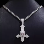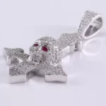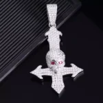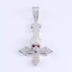 Make a bold statement with this striking Skull Cross Moissanite Pendant. Crafted in sterling silver, this unique pendant features a detailed skull with vibrant red eyes set against an intricately designed cross. The pendant is adorned with 523 dazzling moissanite stones, ranging from 1.0mm to 1.5mm, adding a touch of sparkle to its edgy design. Measuring 66mm in height and 38mm in width, this pendant is perfect for those who love to stand out.”