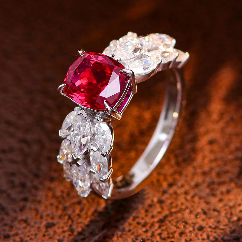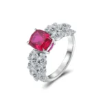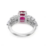 Behold the mesmerizing allure of our white gold Lab Gemstone Ring, a true masterpiece of jewelry craftsmanship. At its center is a vivid, cushion cut lab created ruby gemstone, radiating a passionate red hue that commands attention. Flanking the ruby are meticulously arranged moissanite stones, their brilliant sparkle complementing the rich color of the ruby and creating a harmonious blend of elegance and luxury. The sleek white gold band provides a modern and sophisticated backdrop, enhancing the overall aesthetic of the ring. This ring is not just an accessory; it’s a statement of style and refinement, perfect for any occasion where you want to make a lasting impression.