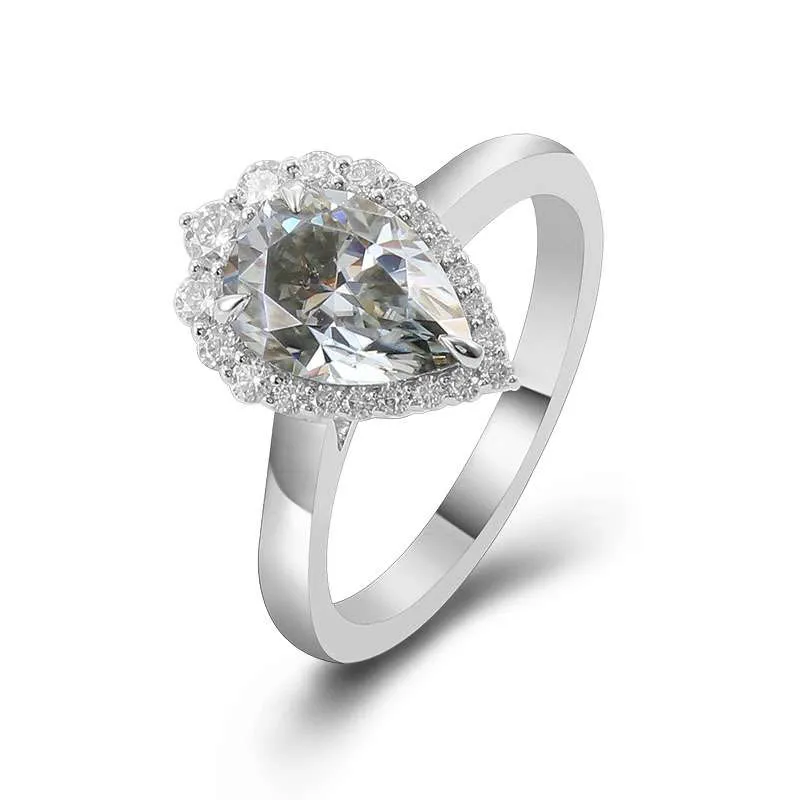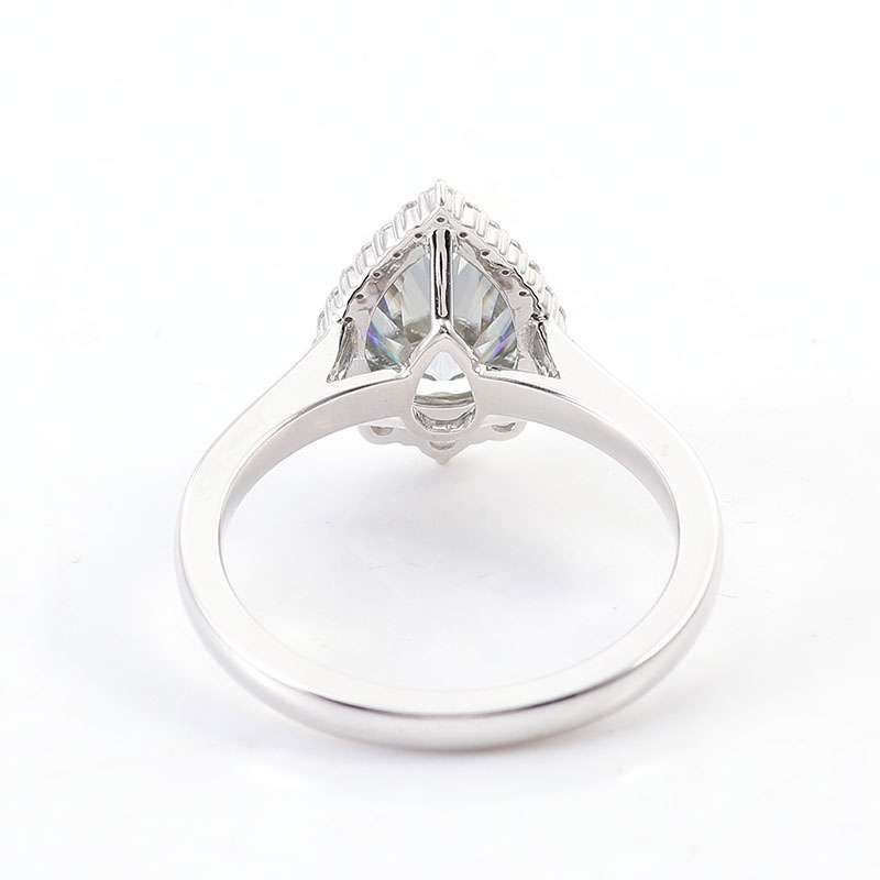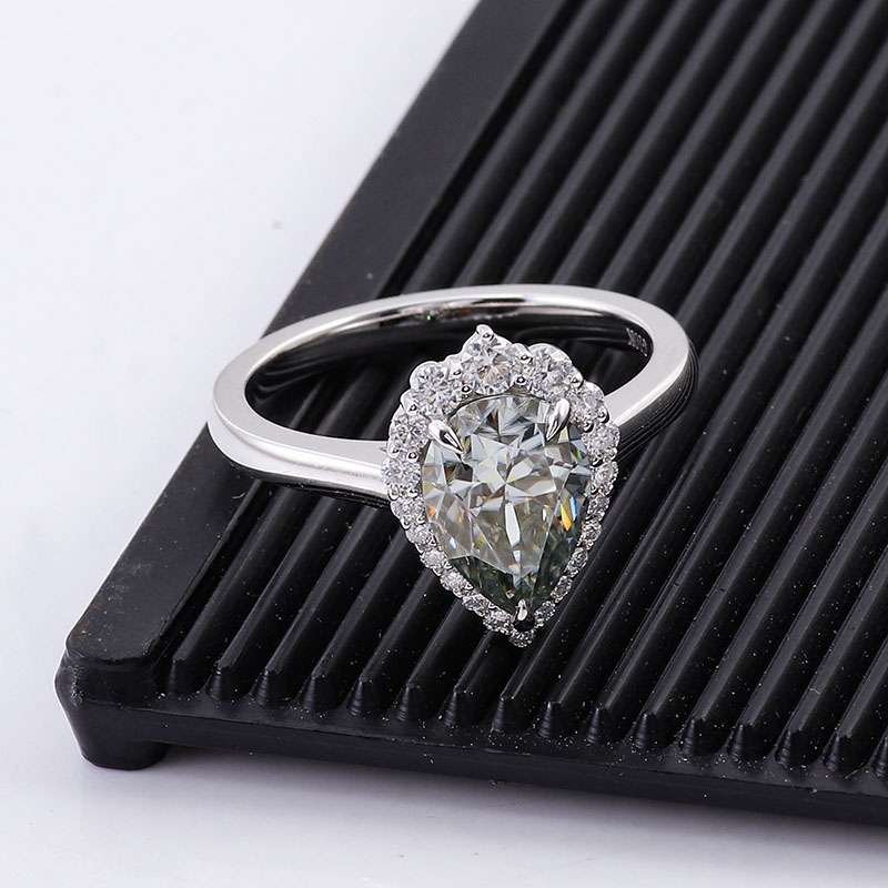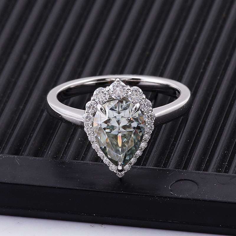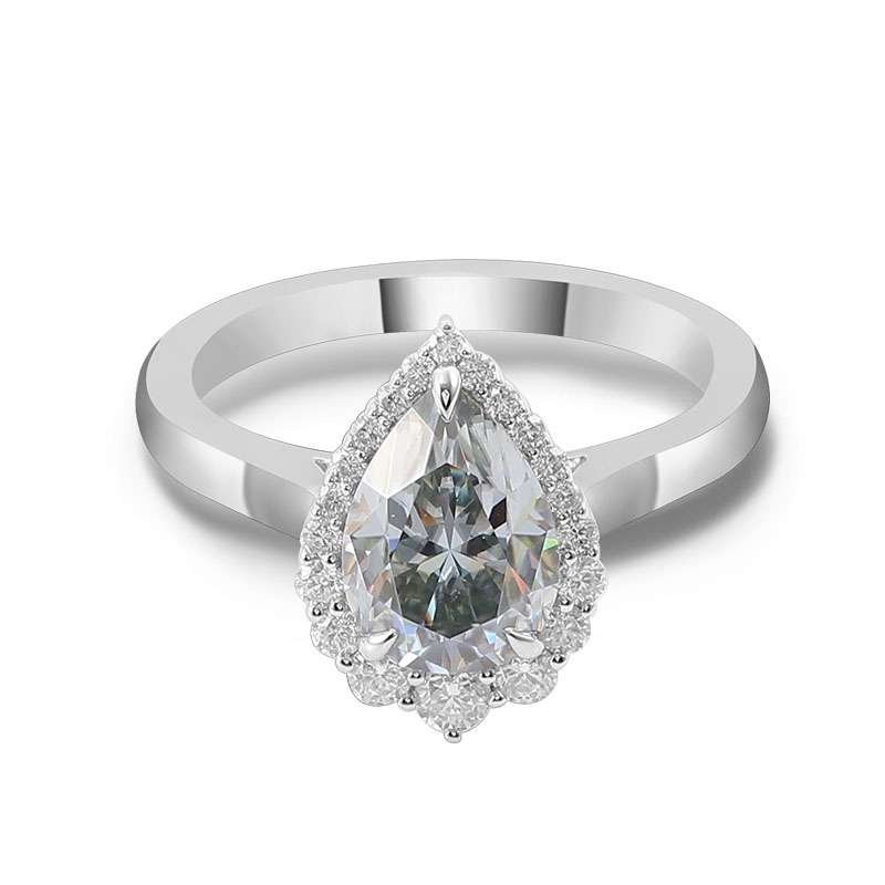 This Engagement Ring ring showcases a VVS clarity moissanite with a gorgeous pear cut. The central stone is surrounded by a halo of smaller stones, all set in premium white gold. It combines charm and sparkle, making it a perfect choice for a memorable proposal or special occasion.