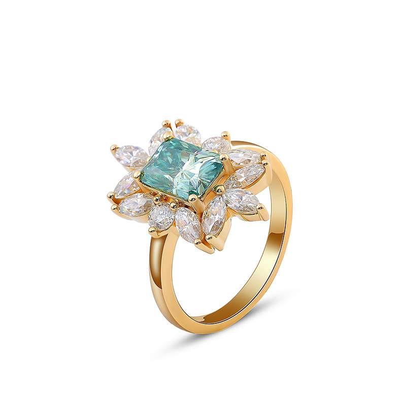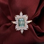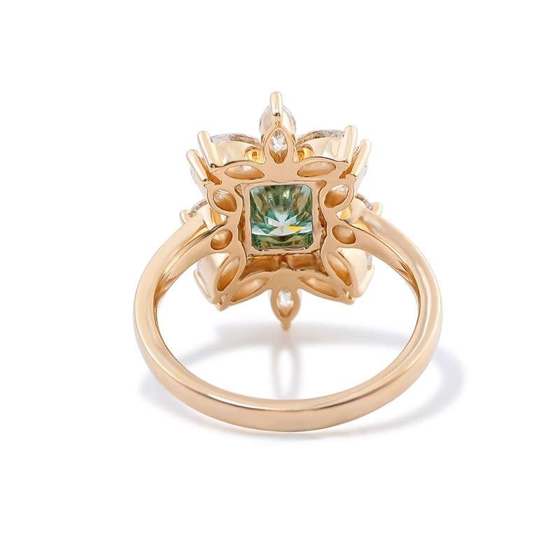 This is a Yellow Gold Moissanite Ring made of yellow gold. It features moissanite stones. The main stone has an emerald cut with a carat weight of a VVS clarity. Surrounding the main stone are additional moissanite stones, which enhance the ring’s dazzling and luxurious appearance. The design combines modernity with elegance, making it a perfect choice for jewelry lovers.