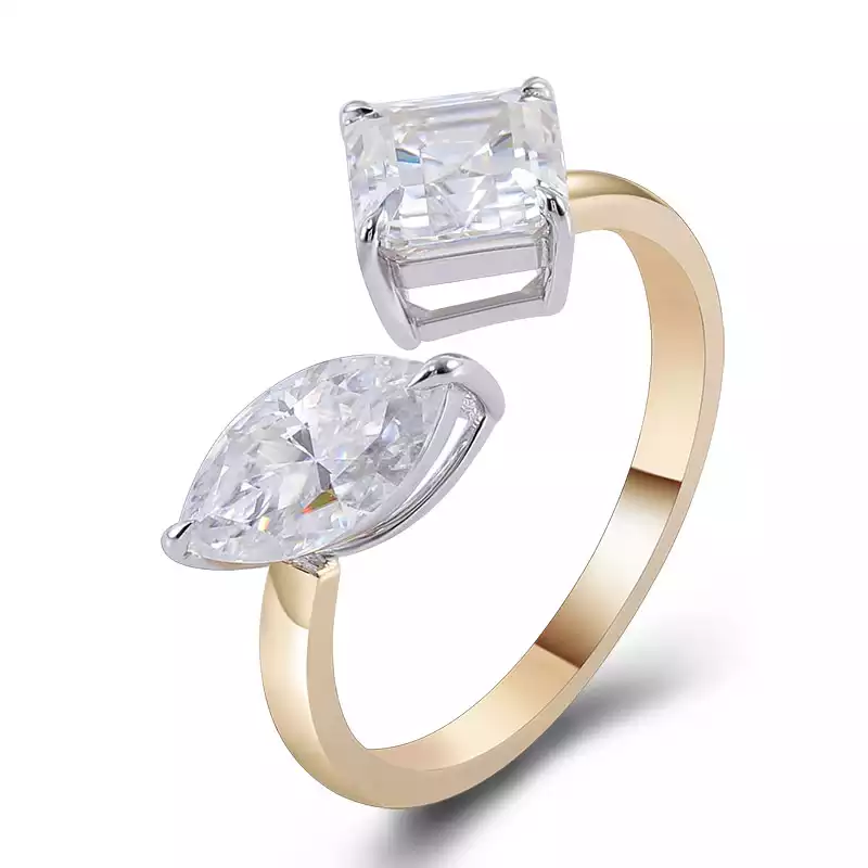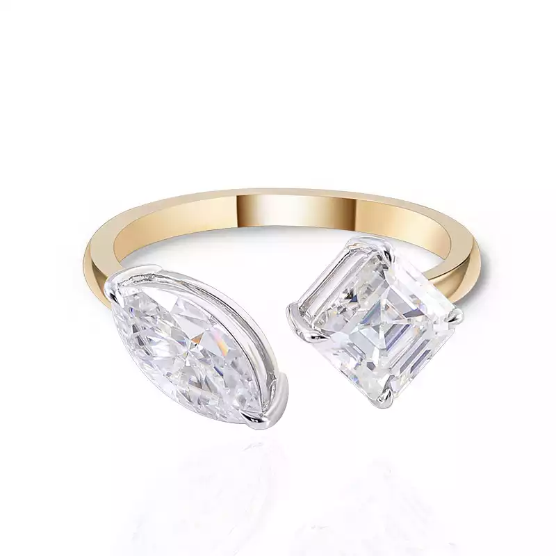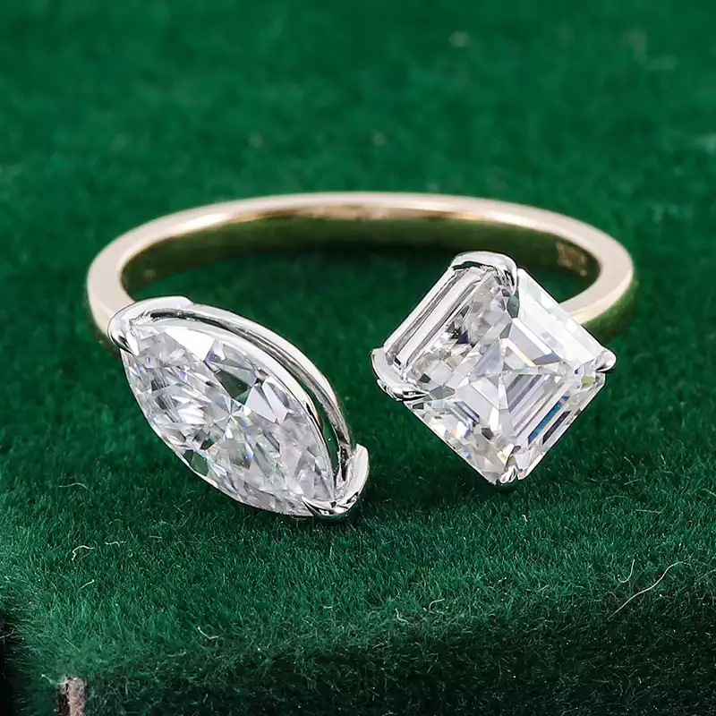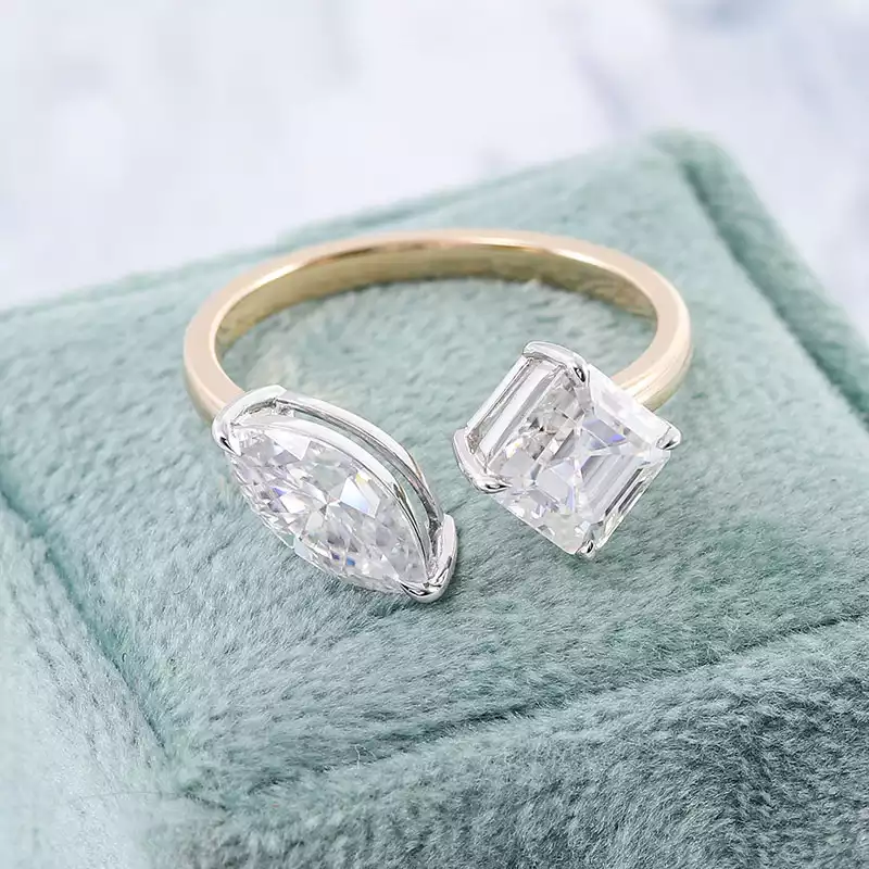 Elevate your style with our mesmerizing moissanite toi-et-moi ring. Featuring a radiant marquise-cut moissanite paired with a striking princess-cut stone, both set in a sleek white gold bezel, this ring exudes unmatched elegance and brilliance. The lustrous yellow gold band adds a touch of warmth and sophistication, making it the ideal accessory for any occasion. Whether for engagements, anniversaries, or as a luxurious self-gift, our moissanite toi-et-moi ring is sure to leave a lasting impression.