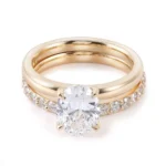 Celebrate love with this exquisite two piece bridal ring set! The centerpiece features a VVS clarity oval cut moissanite, radiating brilliant sparkle, paired with a shimmering moissanite – encrusted band. Crafted in warm yellow gold, this set blends timeless romance with modern luxury. Perfect for engagements and weddings, it’s a symbol of eternal commitment that will dazzle for a lifetime.