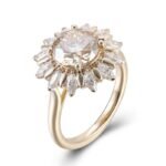 Immerse yourself in the charm of this yellow gold Halo Ring, a masterpiece inspired by delicate flowers. At its heart lies a round cut moissanite of VVS clarity, surrounded by an array of shimmering moissanite accents. The intricate floral like setting not only enhances the ring’s allure but also reflects light from every angle, creating a mesmerizing display of sparkle. Ideal for those who appreciate a blend of elegance and nature inspired design, this ring is perfect for special occasions or as a cherished addition to your daily jewelry.