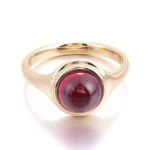 This striking the Ruby Lab Gemstone Ring features a deep red round-cut center stone secured in a smooth bezel setting. The stone’s vibrant saturation through minimalist design. Light interacts with the gem’s facets to create subtle internal flashes, while the polished gold surface reflects warm brilliance. Designed for versatility in both casual and formal settings, this piece blends classic elegance with modern wearability.